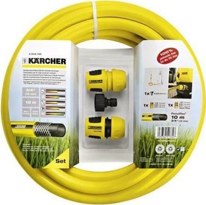 Das Schlauchset eignet sich sowohl als Zulaufschlauch für einen Hochdruckreiniger als auch zur Gartenbewässerung. Das Set besteht aus 10 m phthalatfreiem (< 0,1 %) PrimoFlex-Schlauch (3/4\"), einem G3/4-Hahnanschluss, einer Universal-Schlauchkupplung sowie einer Universal-Schlauchkupplung mit Aqua Stop. Die Gartenschläuche der Kärcher Bewässerungslinie präsentieren sich extrem flexibel, robust und knickfest. Die Vorteile liegen auf der Hand: Lange Lebensdauer und einfache Handhabung für erstklassige Gartenpflege. Denn Bewässern mit Kärcher ist Bewässerung mit Köpfchen.Produkttext[/head]Schlauchset zur Hochdruckreinigung oder Gartenbewässerung. Mit 10 m PrimoFlex®-Schlauch (3/4\"), G3/4-Hahnanschluss, 1 x Universal-Schlauchkupplung sowie Universalkupplung mit Aqua Stop.[head]Hauptmerkmale
