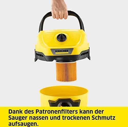 Der WD 3 V-17/4/20 ist saugstark und energieeffizient bei nur 1000 Watt Stromverbrauch. Dabei sind sowohl das Gerät als auch der Saugschlauch und die Clips-Bodendüse optimal aufeinander abgestimmt - für die besten Reinigungsergebnisse bei trockenem, nassem, feinem oder grobem Schmutz. Der Nass-/Trockensauger punktet mit seiner kompakten Bauweise und einem robusten 17-Liter-Kunststoffbehälter, 4 m Kabel, 2 m Saugschlauch und seinem Vliesfilterbeutel.Dank des einteiligen Patronenfilters ist das Aufsaugen von sowohl nassem als auch trockenem Schmutz ohne Filterwechsel möglich. Die Blasfunktion ist nützlich beim Reinigen von schwer zugänglichen Stellen. Die Aufbewahrung des Schlauchs erfolgt platzsparend durch das Einhängen am Gerätekopf. Das Kabel kann am Kabelhaken verstaut werden, Rohre und Bodendüsen am Bumper. Das \"Pull & Push\"-Verschlusssystem ermöglicht einfachstes Öffnen und Schließen des Behälters. Der Handgriff des Saugers kann abgenommen und das Zubehör direkt auf den Saugschlauch gesteckt werden. Ebenfalls clever: Auf der Fläche auf dem Gerätekopf können Werkzeuge oder Kleinteile abgelegt werden. Der ergonomisch geformte Tragegriff ermöglicht den komfortablen Transport.