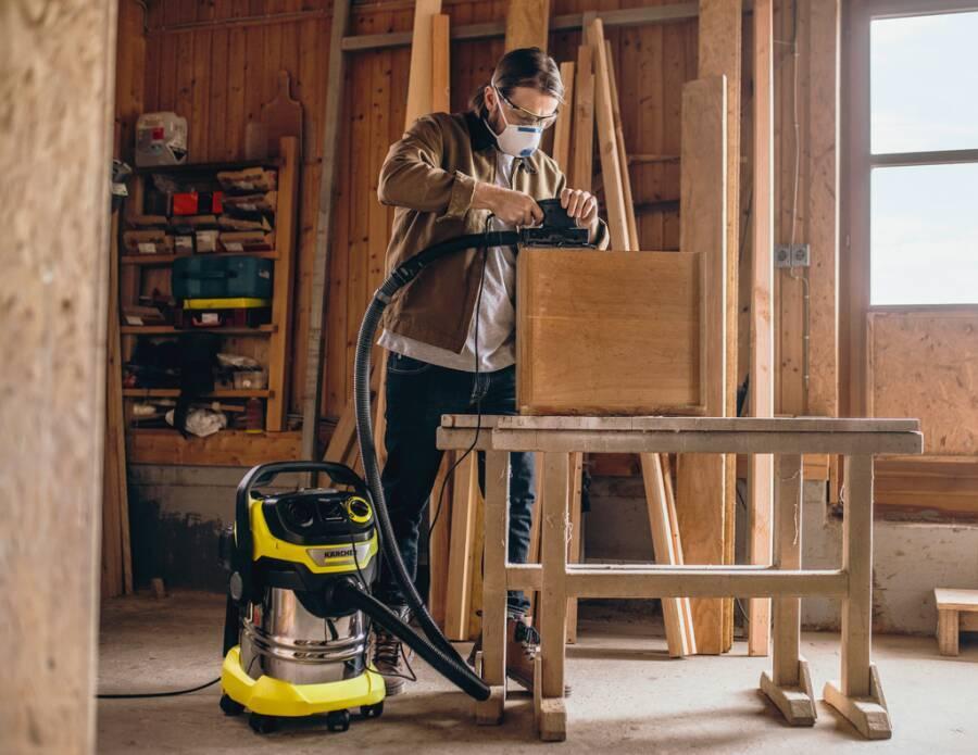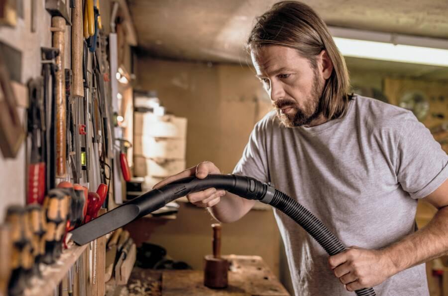 Extrem saugstark und energieeffizient: Mit nur 1100 Watt Stromverbrauch erzielt der Nass-/Trockensauger WD 5 P S V-25/5/22 beste Reinigungsergebnisse - bei trockenem, nassem, feinem oder grobem Schmutz. Das Gerät hat einen robusten 25-Liter-Edelstahlbehälter, 5 Meter Kabel, einen 2,2 Meter langen Saugschlauch, eine umschaltbare Bodendüse, Flachfaltenfilter und Vliesfilterbeutel. Elektrowerkzeuge können an der Steckdose mit Ein-/Ausschaltautomatik problemlos angeschlossen werden. Schmutz, der beim Sägen oder Schleifen entsteht, wird direkt abgesaugt. Mit dem Drehschalter kann die Saugleistung bedarfsgerecht eingestellt werden. Durch die patentierte Filterentnahmetechnik lässt sich der Flachfaltenfilter sekundenschnell ausbauen, ganz ohne Schmutzkontakt. Durch die Betätigung der Abreinigungstaste wird der Filter schnell und effizient gereinigt. Der abnehmbare Handgriff mit elektrostatischem Schutz erlaubt eine direkte Zubehöranbringung am Saugschlauch. Dieser kann platzsparend verstaut werden, indem der Schlauch am Gerätekopf fixiert wird. Rohre und Bodendüse können bei Arbeitsunterbrechungen ebenfalls schnell und bequem in der Parkposition am Bumper zwischengeparkt werden.