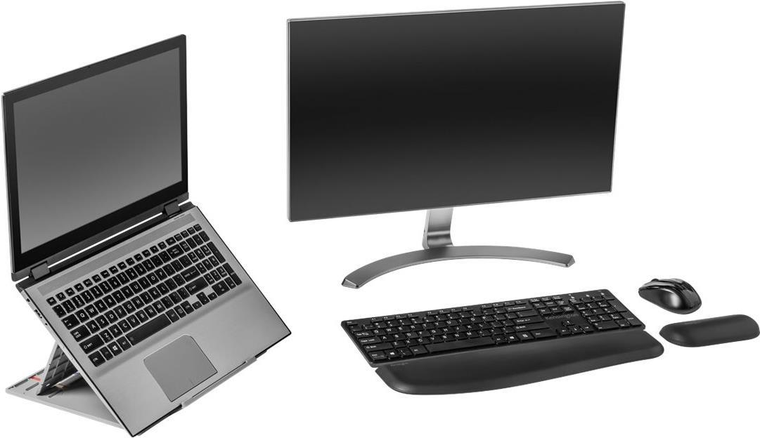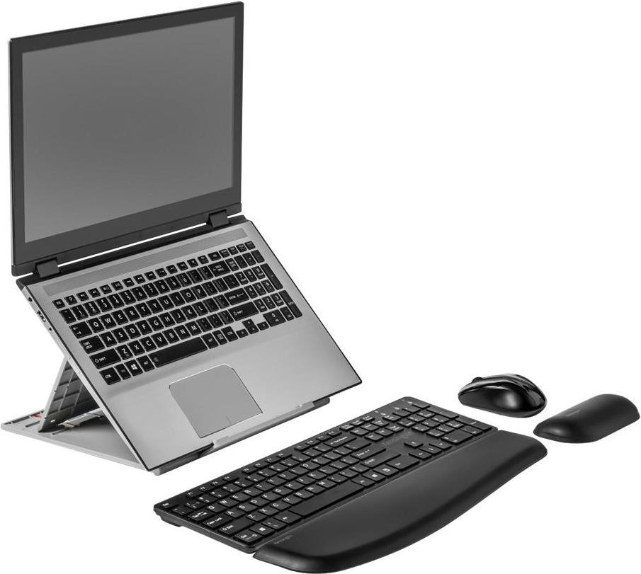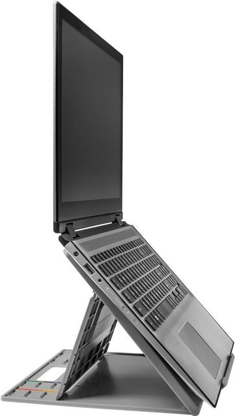 Kombinieren Sie die ergonomischen und technologischen Vorteile des höhenverstellbaren Kensington SmartFit Easy Riser Go 17" Laptopständers, der nicht nur für eine optimale Bildschirmhöhe sorgt, sondern auch für eine verbesserte Luftzirkulation für Ihren Laptop. Das elegante 2-in-1-Design ist höhen- und winkelverstellbar für eine gesunde Körperhaltung und dank der angenehmen Arbeitshöhe eine Entlastung für Nacken und Schultern. Ein zusätzlicher Vorteil ist das Ableiten der Wärme und damit die Kühlung der Laptopkomponenten. Die rutschfeste Fußmatte verhindert, dass der Ständer nach vorne rutscht, die gepolsterten Einsätze sorgen für einen sicheren Sitz Ihres Geräts und das schlanke, klappbare Design ist ideal für unterwegs. Verwendung mit einer externen Tastatur und Maus (separat erhältlich). Unterstützt 17" Standard- und Gaming-Laptops.