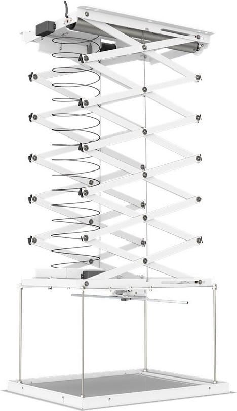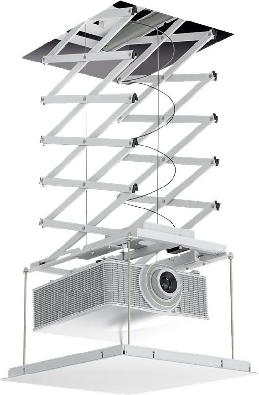 Installationsfreundlicher motorischer Deckenlift für Installations- projektoren mit einem Gewicht von bis zu 30 kg, maximale Hublänge 120 cm. Hochwertige und stabile Ausführung, inkl. Projektorenhalterung mit extra langen Spinnenbeinen (Diagonalabstand: 200 bis 550 mm) und Feineinstellung in 3 Achsen: drehen ±5°, kippen ±4°, neigen ±5°. Mit Kabelspirale zur knickfreien Kabelführung. Die integrierte Sicherheitsschaltung stoppt den Lift beim Auffahren auf ein Hindernis in Abwärtsrichtung.Hauptmerkmale