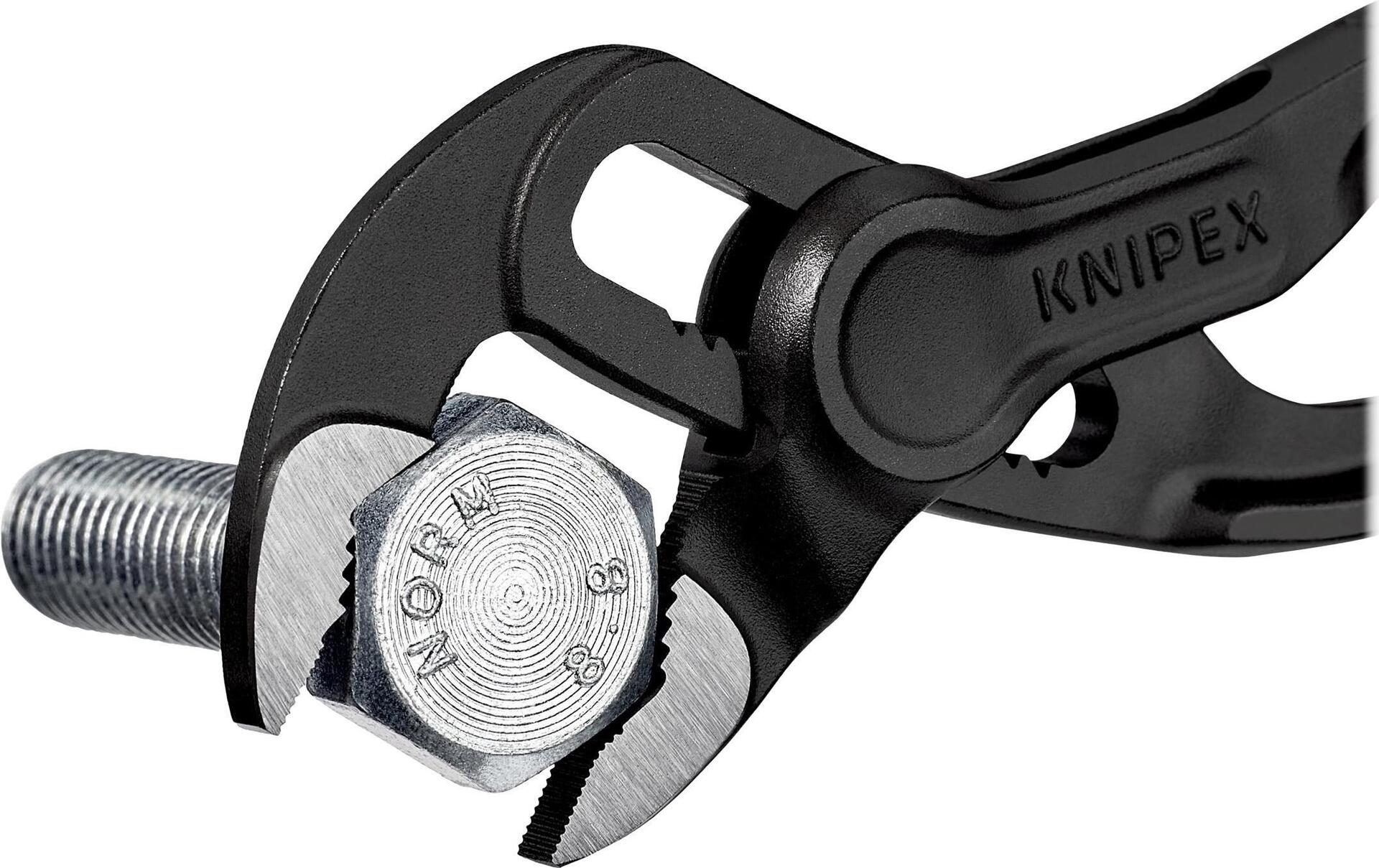 Klein, handlich und alles andere als ein Spielzeug! Die Cobra XS erweitert die KNIPEX Cobra-Familie um ein kompaktes neues Mitglied. Sie ist eine vollfunktionsfähige Hightech-Wasserpumpenzange, die ganz besonders bei engen Platzverhältnissen ihre Größe beweist. Per Feinverstellung direkt am Werkstück bietet sie elf Einstellpositionen, die Muttern bis 24 mm Durchmesser und andere Werkstücke sogar bis zu einem Durchmesser von 28 mm greifen - und das bei nur 100 Millimeter Länge. Aufgrund ihrer geringen Größe lässt sich die Cobra XS bequem mit nur einer Hand bedienen. Die Cobra XS ist natürlich - wie alle Mitglieder der KNIPEX Cobra-Familie - selbstklemmend an Rohren und Muttern: So wird das Abrutschen am Werkstück verhindert und Arbeiten wie Greifen, Halten, Pressen und Biegen sind deutlich kraftsparender.