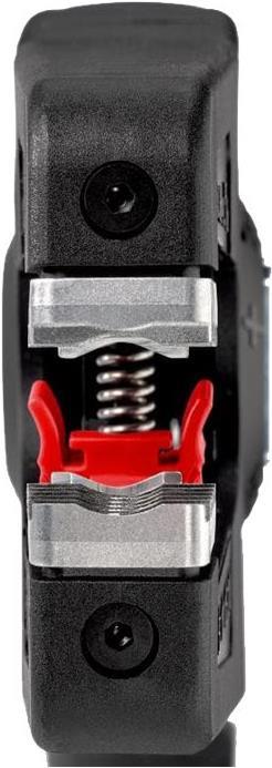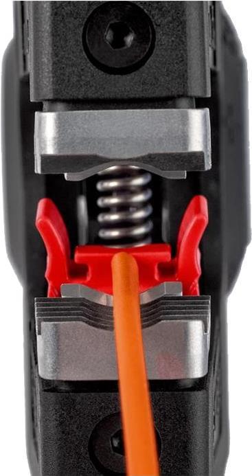 Das Herzstück der Hightech-Abisolierzange besteht aus parabelförmigen Messern, die zunächst die Isolation von sowohl feindrähtigen als auch massiven Rundkabeln trennen und diese dann ganz automatisch nach hinten abziehen. Dabei umschließt das Messerpaar weitgehend die Isolation und eignet sich so auch für viele flexible Materialien.