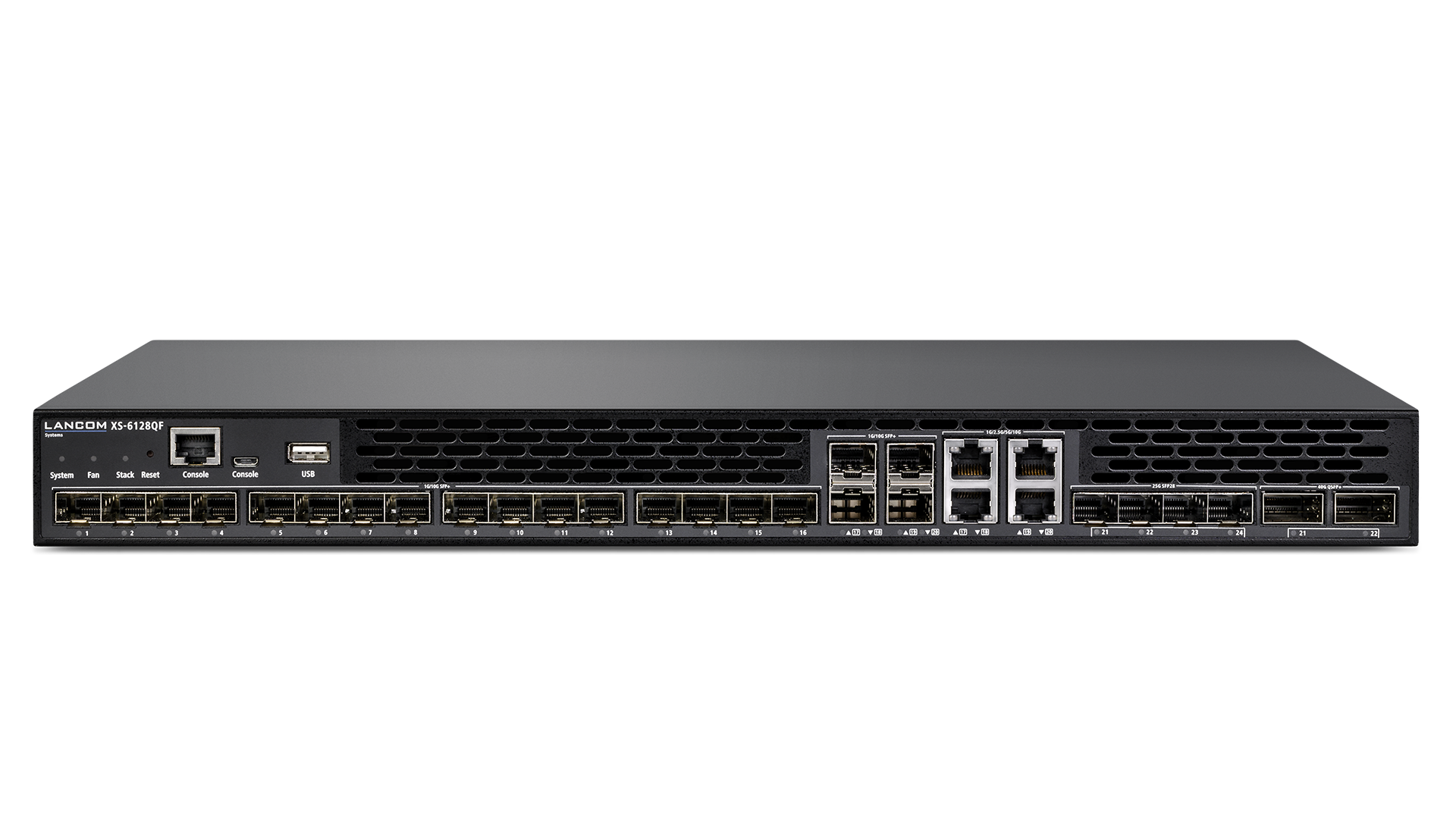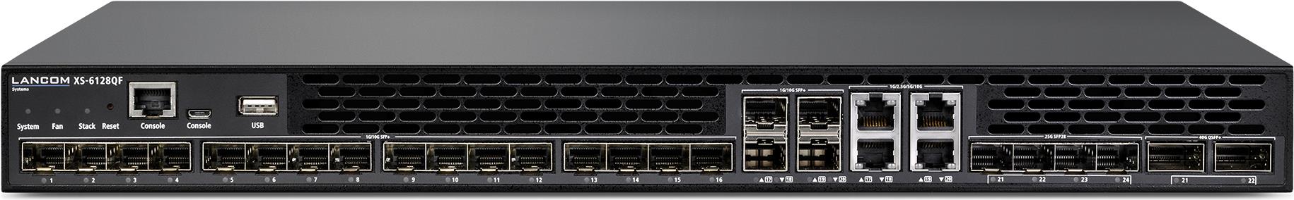 LANCOM XS-6128QF - Switch - L3 - managed - 16 x 10 Gigabit SFP+ + 4 x combo 10 Gigabit SFP+/RJ-45 + 4 x Combo 25 Gigabit SFP28 (Uplink) + 2 x Combo 40 Gigabit QSFP+ (Uplink) - Luftstrom von vorne nach hinten - an Rack montierbar (61860)