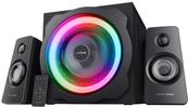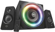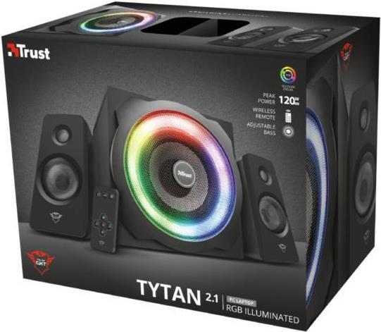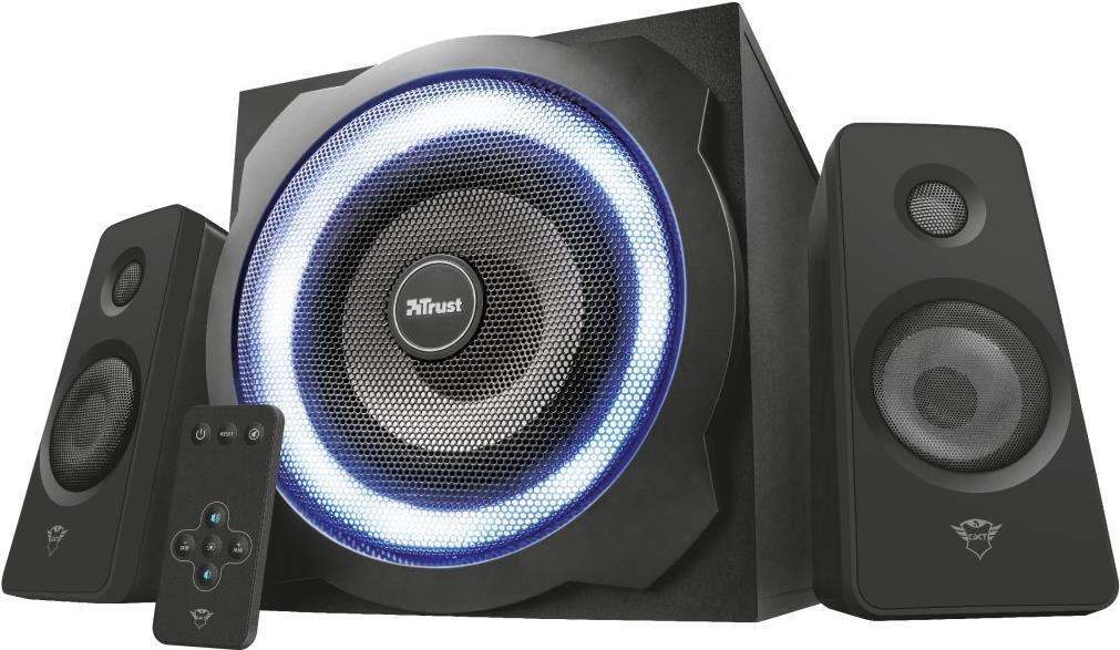 Leistungsfähiges 2.1-Lautsprecherset mit einstellbarer RGB-LED-Beleuchtung und kabelloser Fernbedienung.