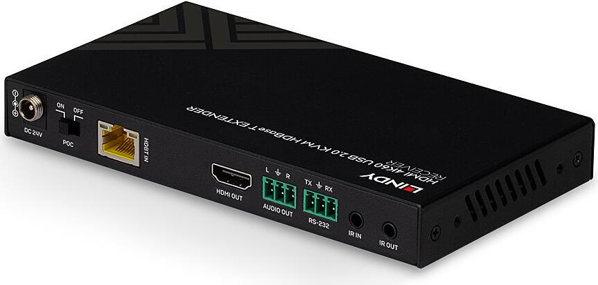 | Schnittstellen | 1 x HDBaseT (Eingang) - RJ-45 weiblich 1 x IR-Eingang - 3.5 mm weiblich 1 x HDMI-Ausgang - HDMI Typ A, 19-polig weiblich 2 x USB 2.0 (Ausgang) - Type A weiblich 1 x Audio (Ausgang) - 3-poliger Klemmenblock 1 x IR-Ausgang - 3.5 mm weiblich 1 x RS-232 (bidirektional) - 3-poliger Klemmenblock |