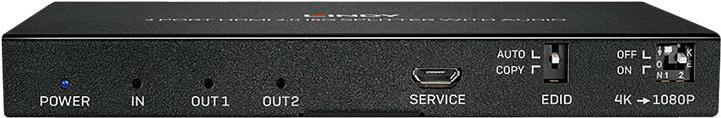 Verteilt HDMI 18G-Signale auf 2 Displays und extrahiert digitales oder analoges Audio.