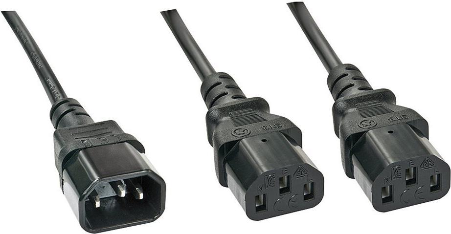 IEC C14 Kaltgerätestecker an 2x IEC C13 Kaltgerätebuchse.
