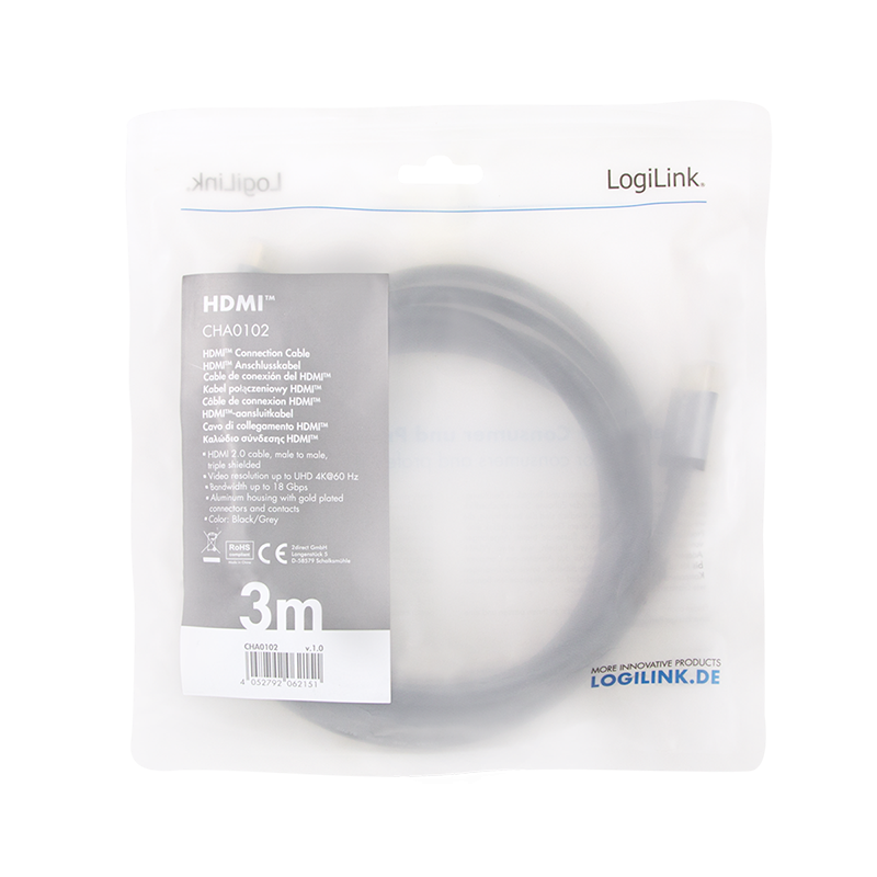 Logilink - Highspeed - HDMI-Kabel mit Ethernet - HDMI männlich zu HDMI männlich - 3 m - Dreifachisolierung - Schwarz - unterstützt 4K 60 Hz (3840 x 2160) (CHA0102)