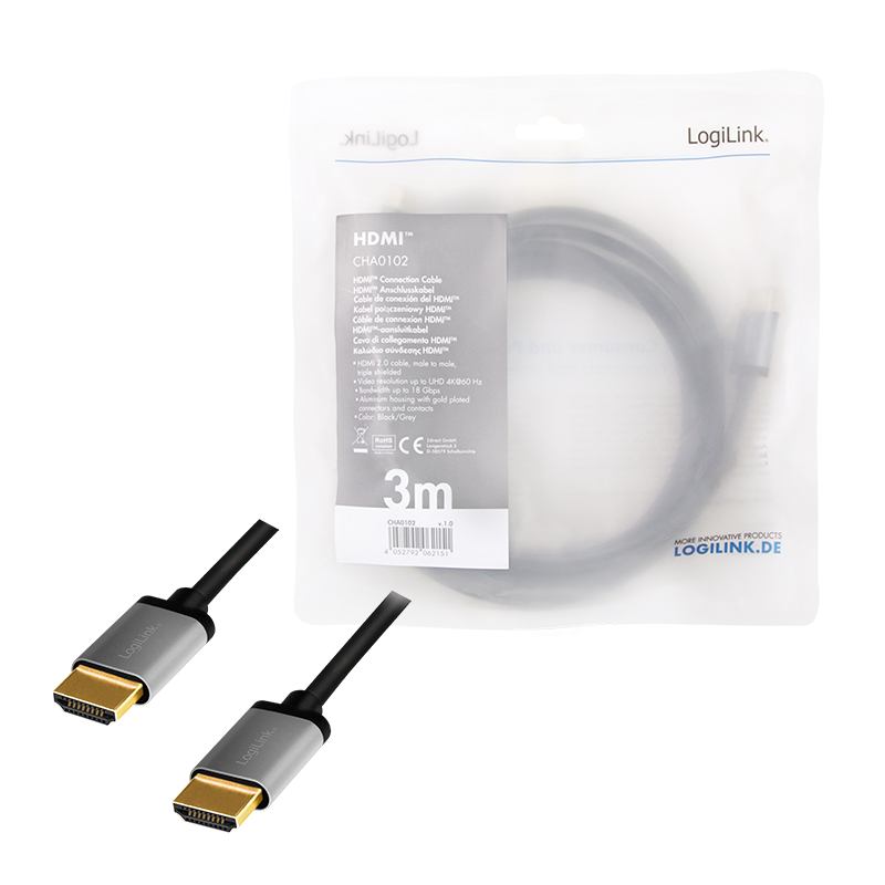 Das HDMI-High-Speed-Anschlusskabel mit Ethernet von LogiLink überträgt Audio, Video und Daten. Es unterstützt Auflösungen bis zu 3840x2160 bei 60 Hz, Ultra HD, 4Kx2K und 3D. Die vergoldeten Stecker garantieren zudem einen optimalen Kontakt.
