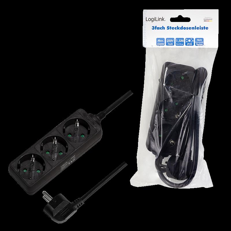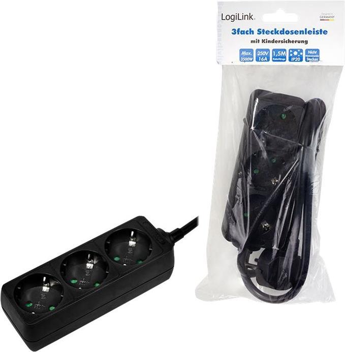 Steckdosenleiste mit 3 Schutzkontaktbuchsen von LogiLink. Buchsen mit Kindersicherung. Kabellänge 1,5 m.