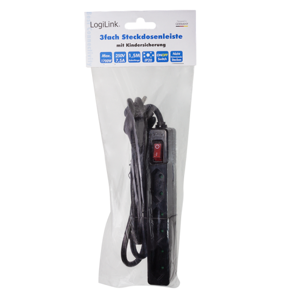 Logilink - Slim - Verlängerungsschnur - Wechselstrom 250 V - 1700 Watt - Ausgangsanschlüsse: 3 (Eurostecker) - 1.5 m - Schwarz (LPS230B)