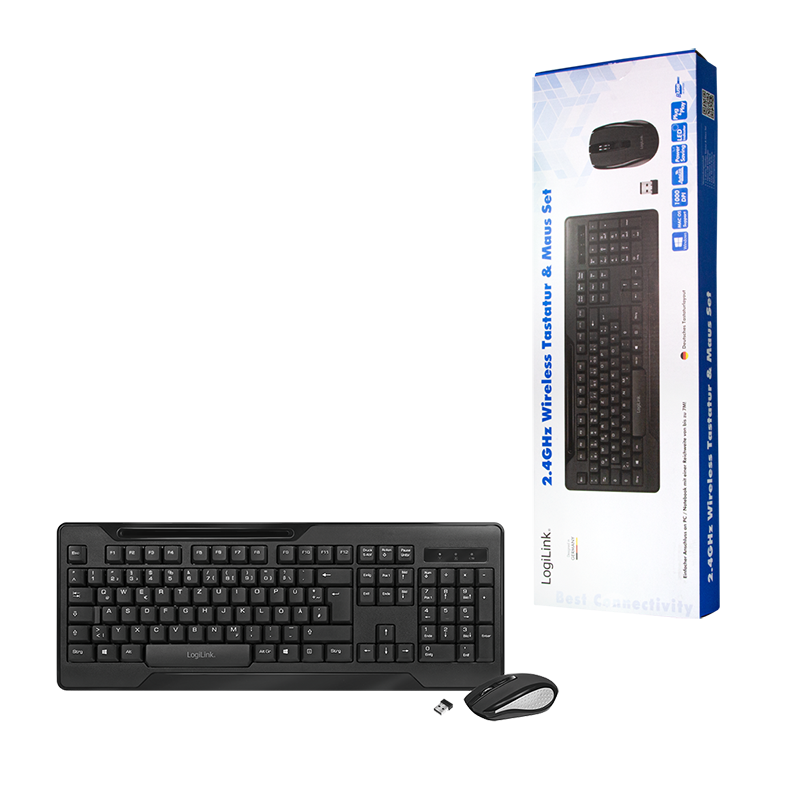 Das 2,4 GHz Funk Tastatur und Maus Set von LogiLink ermöglicht Ihnen ein schnelles und bequemes Arbeiten. Die Maus mit optischem Sensor gewährleistet bei 1000 dpi Abtastung höchste Präzision. Der Anschluss erfolgt über den mitgelieferten USB Micro Dongle. Dieser erkennt die Geräte durch die Autolink Funktion automatisch. Die Tastatur hat zusätzlich Ablauflöcher im Boden die verhindern, dass Wasser in die elektrischen Komponenten gelangt; die Tasten lassen sich zur gründlichen Reinigung und Wartung leicht entfernen.