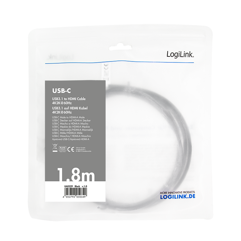 LogiLink USB-C - HDMI Anschlusskabel, 1,8 m, schwarz USB-C 3.1 Stecker - HDMI 2.0 Stecker, Auflösung: 4K x 2K, - 1 Stück (UA0329)