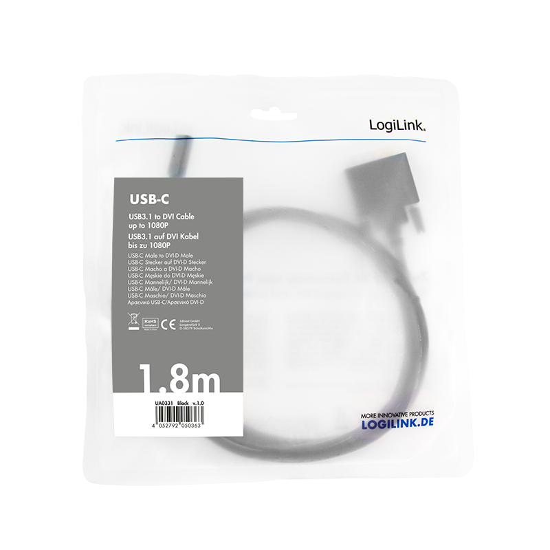 LogiLink USB-C - DVI Adapterkabel, 1,8 m, schwarz USB-C 3.1 Stecker - DVI Stecker, Auflösung: 1080p, 60 Hz, - 1 Stück (UA0331)