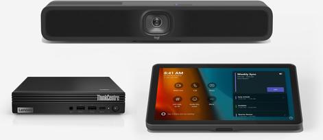 Rüsten Sie Ihre kleinen Räume mit Lösungen der Einstiegsklasse für Microsoft Teams-Räume auf, einschließlich Logitech Tap Controller mit USB-Kit, Logitech MeetUp 2 und Lenovo ThinkSmart Tiny Mini-PC.