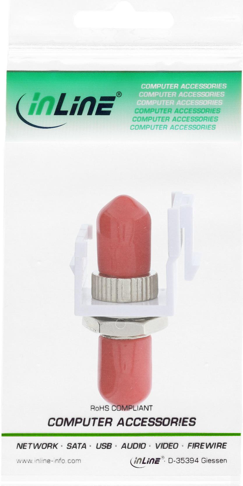 Die InLine® LWL Keystone Snap-in Kupplung dient zum Verbinden von 2 LWL-Kabeln mit ST-Stecker. Die Snap-in-Bauform (auch Keystone genannt) ermöglicht den Einbau in entsprechende Patchfelder, Wanddosen, Bodentank-Steckdosen, etc.• LWL Keystone Snap-in Kupplung weiß, Metallkupplung