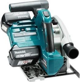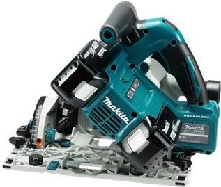 Eine präzise Tauchkreissäge mit bürstenlosem Motor. Die Säge erreicht mit einem Sägeblattdurchmesser von 165 mm eine Schnitttiefe von 56 mm. Der Schnittpunkt bleibt in allen Neigungen (-1° bis +48°) an exakt der gleichen Stelle. Die Säge kippt auch bei größtem Neigungswinkel nicht von der Führungsschiene.