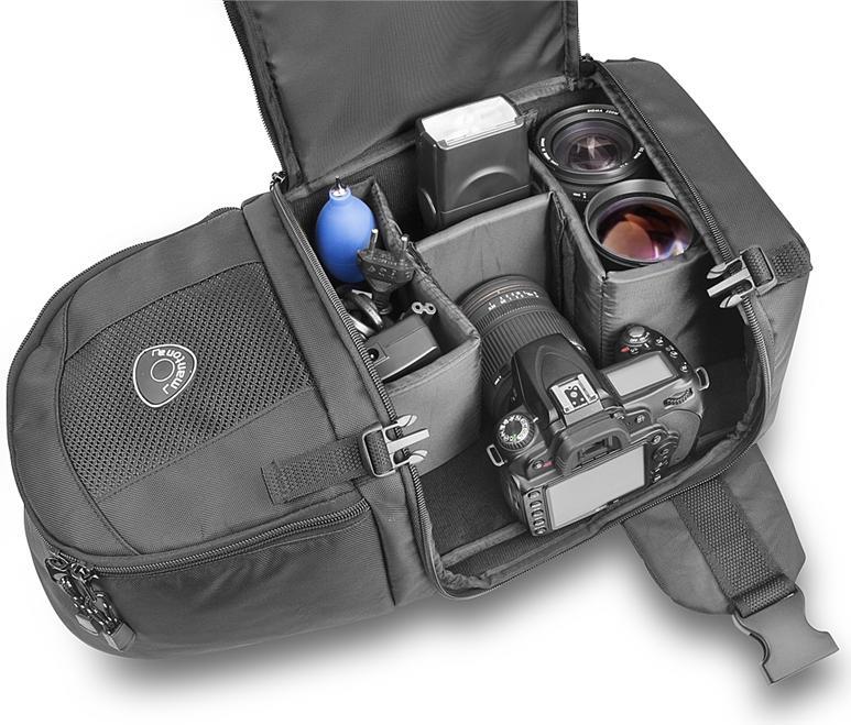 Der mantona Loop ist die erste Wahl für Fotografen, denen der blitzschnelle Zugriff auf ihre Kamera wichtig ist. Getragen wird der mantona Loop mit einem rutschfesten Tragegurt, der dank seiner ergonomischen Form für eine optimale Gewichtsverteilung sorgt. Für den schnellen Zugriff auf den individuell einteilbaren Innenraum schwingen Sie den Rucksack im Handumdrehen vor sich. Sicherheitsschnallen verhindern dabei ein zu weites Öffnen und ein Herausfallen Ihres Equipments. Die Schnallen lassen sich für ein einfaches Beladen lösen. An der Oberseite befindet sich ein großes Fach für weiteres Zubehör oder Persönliches. Die kleinere Tasche an der Vorderseite hat Fächer für Speicherkarten und Filter.