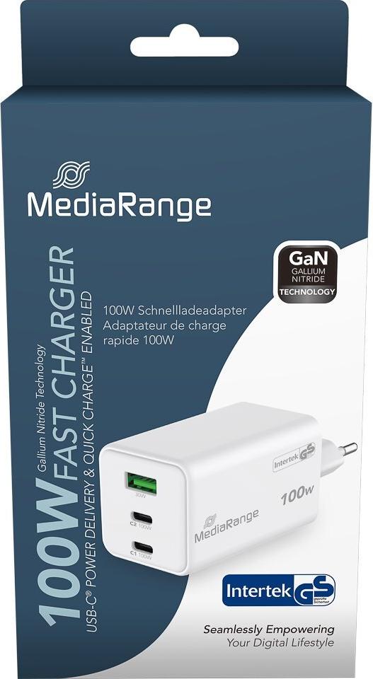 MediaRange 100W GaN Schnellladeadapter (EU-Stecker), 2x USB-C und 1x USB-A, unterstützt USB-C® Power Delivery und Quick Charge?, Weiß (MRMA123)