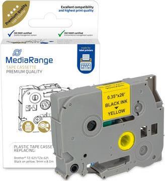 MediaRange Kunststoff-Schriftbandkassette, für/ersetzt Brother TZ-621/TZe-621, permanent haftend, 9mm, 8m, laminiert, schwarz auf gelb MediaRange Schriftbandkassetten sind passgenau auf die jeweiligen Beschrftungsgeräte abgestimmt und ermöglichen einen unkomplizierten Austausch. Unsere permanent-haftenden Kunststoffbänder erzielen perfekt lesbare Ausdrucke und sind dank Laminierung äußerst witterungsbeständig.