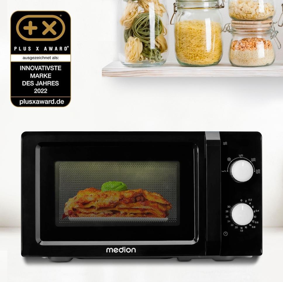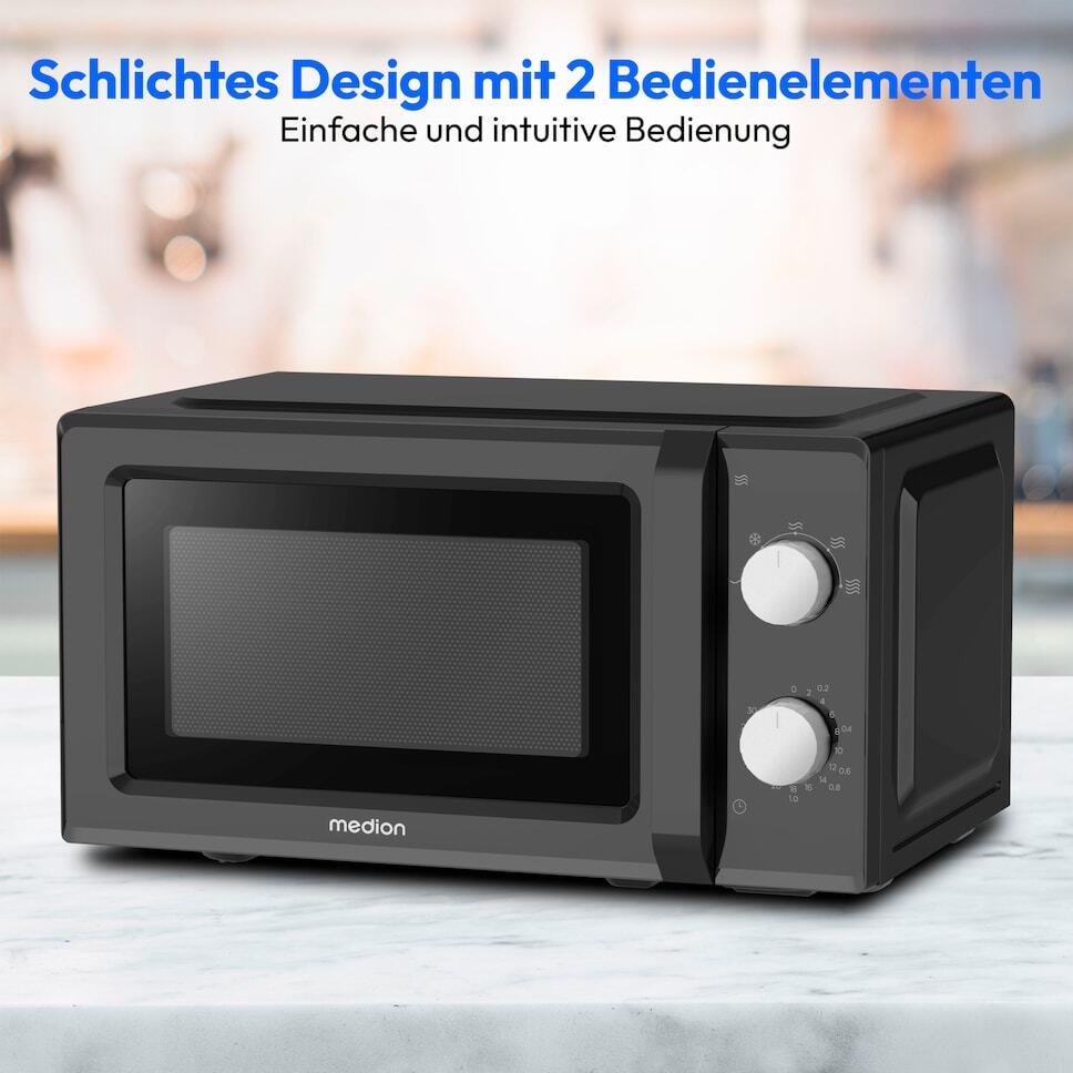 Medion MD 11475 Mikrowelle schwarz/weiß 20l - • 700 Watt Leistung - 20l Garraumvolumen • 30 Minuten Timer - Innenbeleuchtung • Auftaufunktion • Drehteller (spülmaschinengeeignet) (50073790)