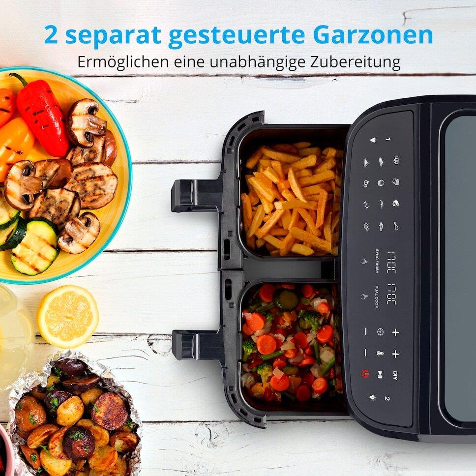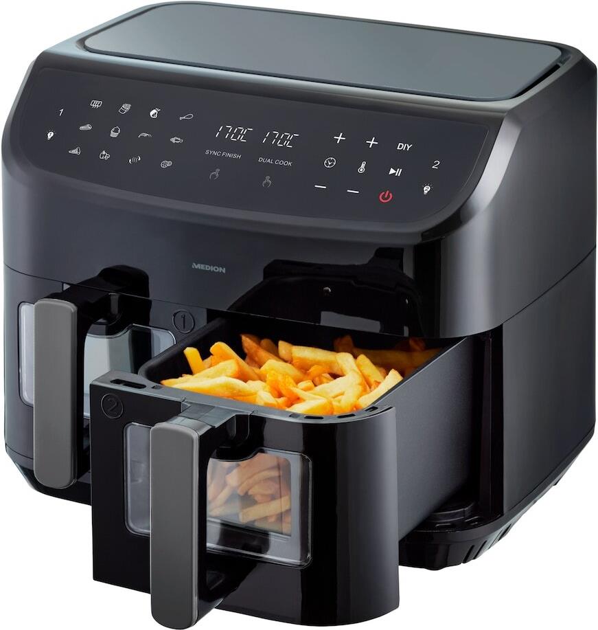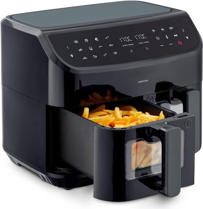 MEDION LIFE P20 XXL Twin DoppelzonenHeißluftfritteuse MD 11760 - 2 separate Garzonen - 9 Automatikprogramme - 8,7 L Gesamt-Nutzinhalt - 2.600 Watt - Temperatur einstellbar bis 200 °C (50072937)