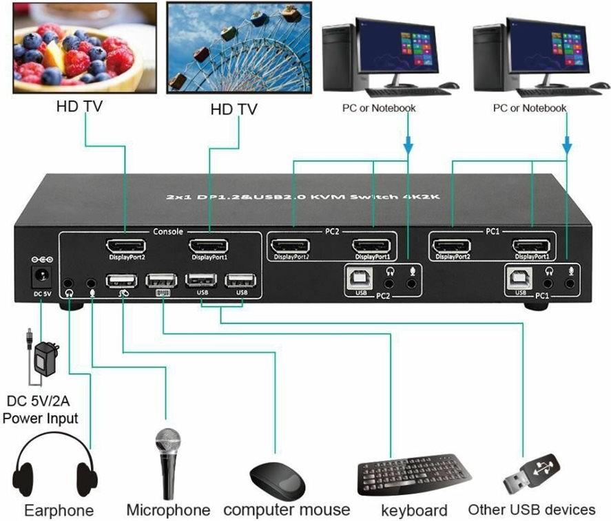 Der 4K Displayport & USB 2 x 1 KVM-Switch ermöglicht es Ihnen, einen HDTV oder Bildschirm, eine USB-Tastatur und -Maus mit Audio und Mikrofon zwischen zwei USB- und Dual-Head-DP-Computern zu teilen. Er verfügt über zwei zusätzliche USB 2.0-Ports mit Überstromerkennung und -schutz für zusätzliche Geräteanschlüsse. Er unterstützt Auflösungen von bis zu 3840*2160@30Hz mit einer Videodatenrate von bis zu 21,6 Gbps, Dolby True HD und DTS HD Master Audio Formate. Außerdem bietet er ein Metallgehäuse für bessere HF-Abschirmung und ermöglicht dem Benutzer, zwischen Geräten über einen vorderen Druckknopf oder Hotkey zu wechseln. Der 4K Displayport & USB 2 x 1 KVM-Switch ist DP v1.2 konform, CE, FCC regulativ genehmigt und RoHS-konform. Er ist vollständig kompatibel mit einer Vielzahl von Windows- und Mac OS-Betriebssystemen.