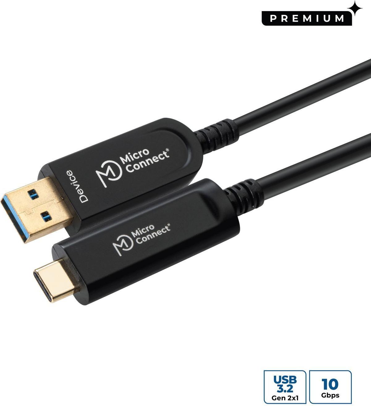 Microconnect MC-USB3.2CA10OP. Kabellänge: 10 m, Anschluss 1: USB A, Anschluss 2: USB C, USB-Version: USB 3.2 Gen 2 (3.1 Gen 2), Maximale Datenübertragungsrate: 10000 Mbit/s, Beschichtung Steckerkontakte: Gold, Produktfarbe: Schwarz (MC-USB3.2CA10OP)