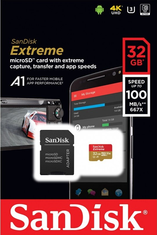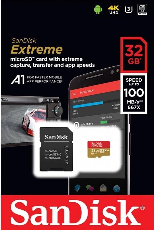MicroSDHC Extreme 32GB SanDisk Speicherkarte mit Adapter, Kapazität: 32GB (SDSQXAF-032G-GN6MA)