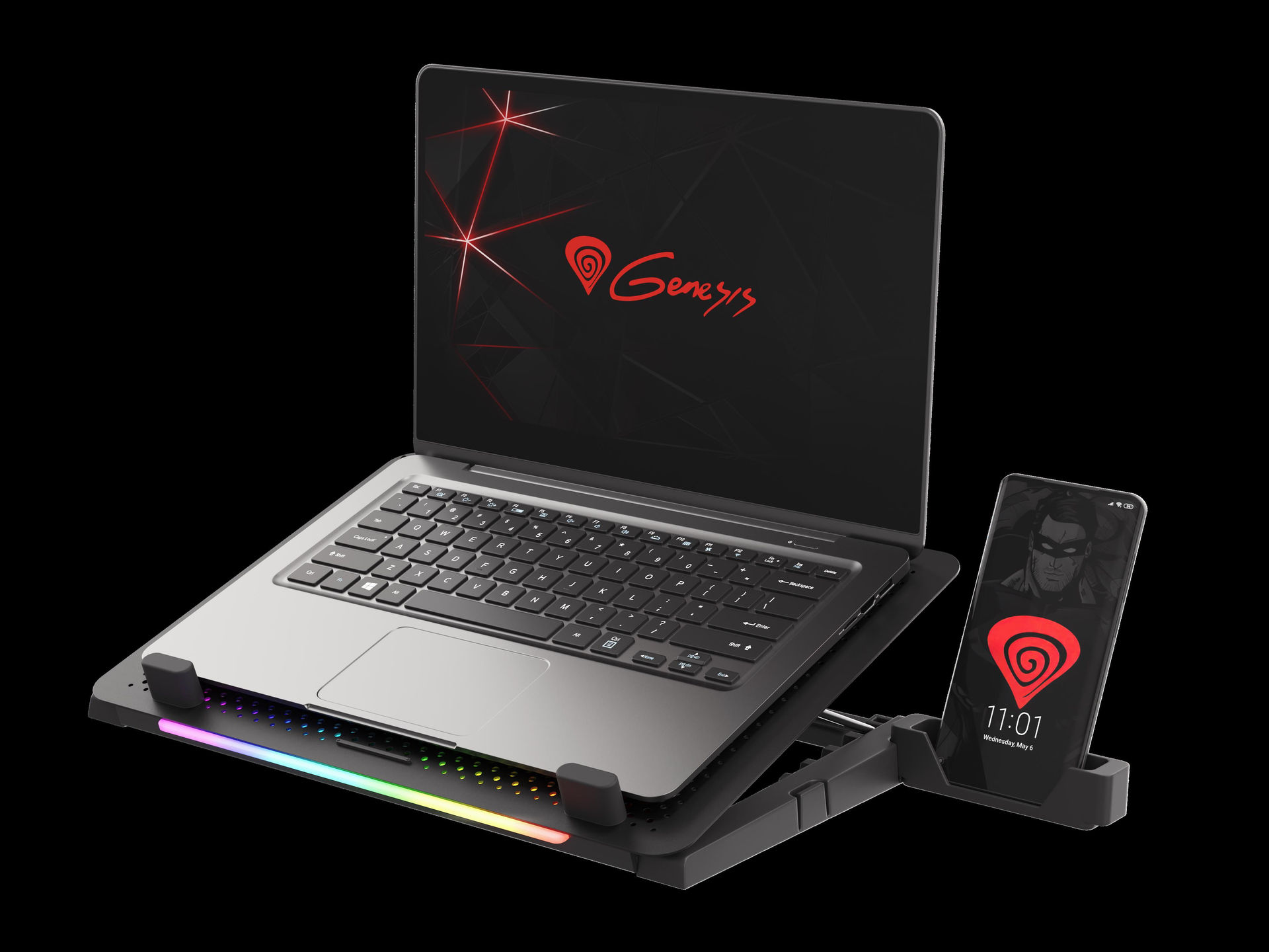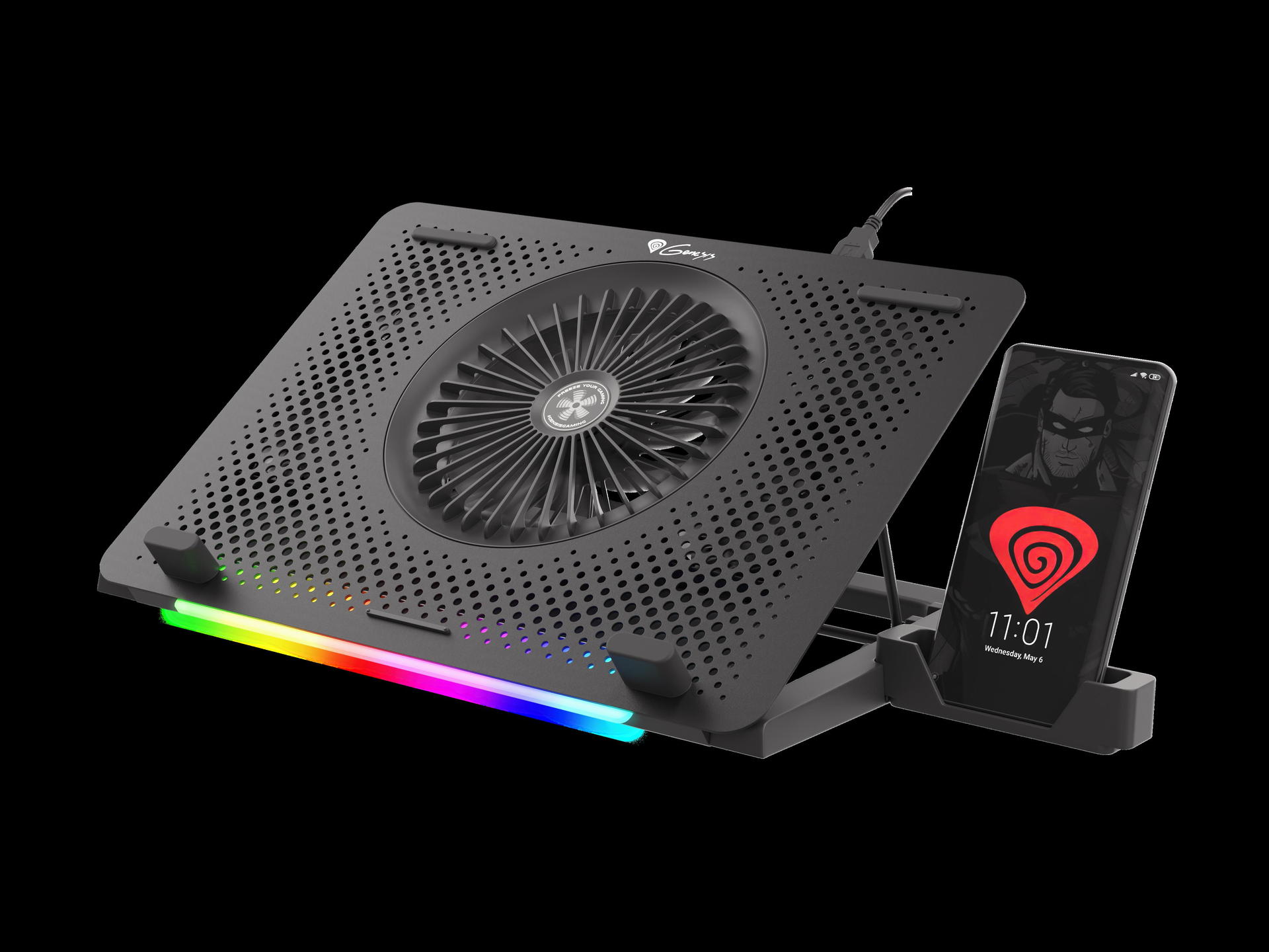 Ausgestattet mit einem integrierten 2-Port-USB-Hub bietet das Genesis OXID 450 zusätzlichen Komfort, da Sie weitere Geräte ganz einfach anschließen können. Der abnehmbare Handyhalter erhöht die Funktionalität und hält Ihr Smartphone während der Arbeit oder beim Spielen für Benachrichtigungen und Anrufe in Reichweite. Mit RGB-LED-Beleuchtung bietet dieses Kühlpad eine gute Leistung und verleiht Ihrem Setup gleichzeitig einen Hauch von Stil. Die einstellbare Neigung ermöglicht fünf Höhenstufen für individuellen Komfort und macht es zu einer vielseitigen Ergänzung für jeden Arbeitsplatz.