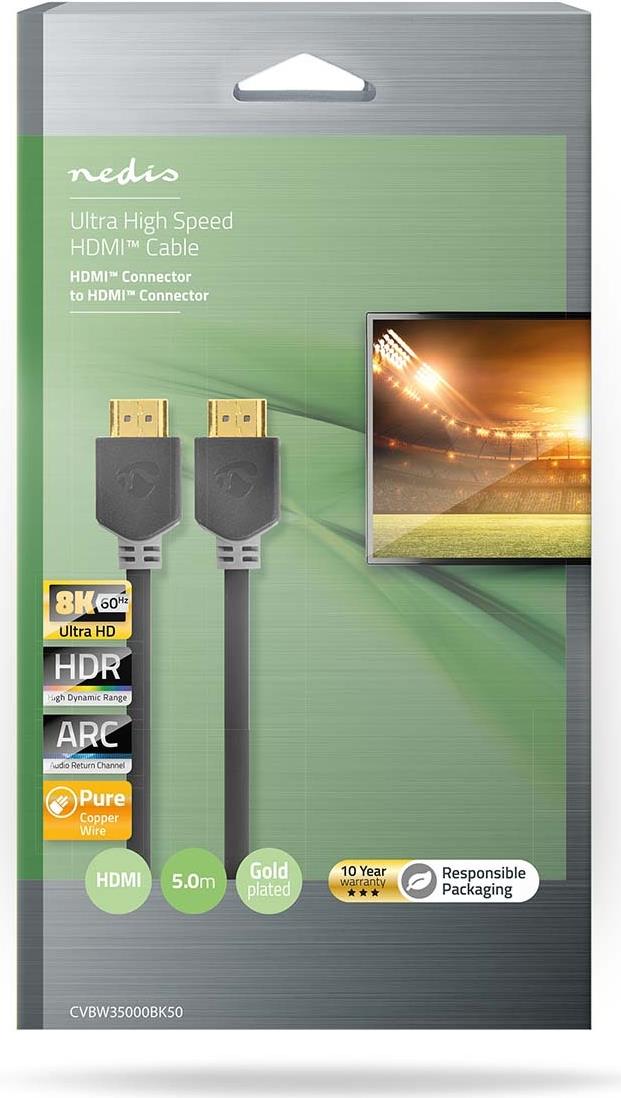 Nedis CVBW35000BK50. Kabellänge: 5 m, Anschluss 1: HDMI Typ A (Standard), Steckverbinder 1 Geschlecht: Männlich, Anschluss 2: HDMI Typ A (Standard), Steckverbinder 2 Geschlecht: Männlich, Beschichtung Steckerkontakte: Kupfer, Audio Return Channel (ARC), Produktfarbe: Schwarz (CVBW35000BK50)