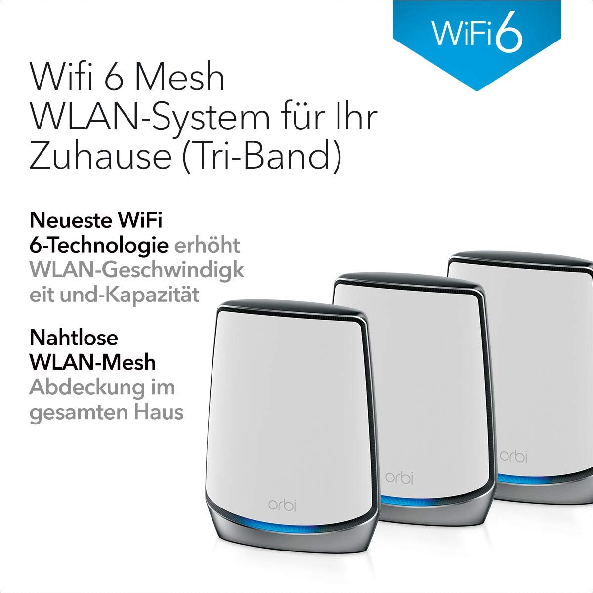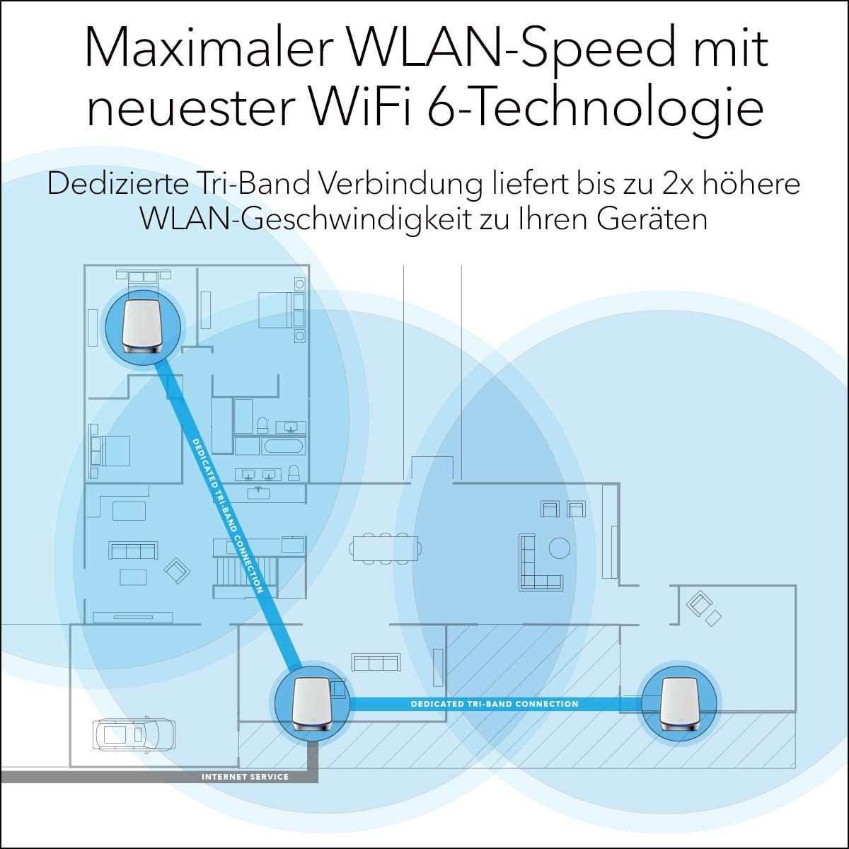 Netgear Orbi RBK853 WiFi 6 Mesh-WLAN-System (6.000 MBit/s Geschwindigkeit, Tri-Band 3er Set mit Mesh-Router + 2x Mesh-Satellit-Repeater, bis zu 525 m² Abdeckung, AX6000 für 60+ Geräte)