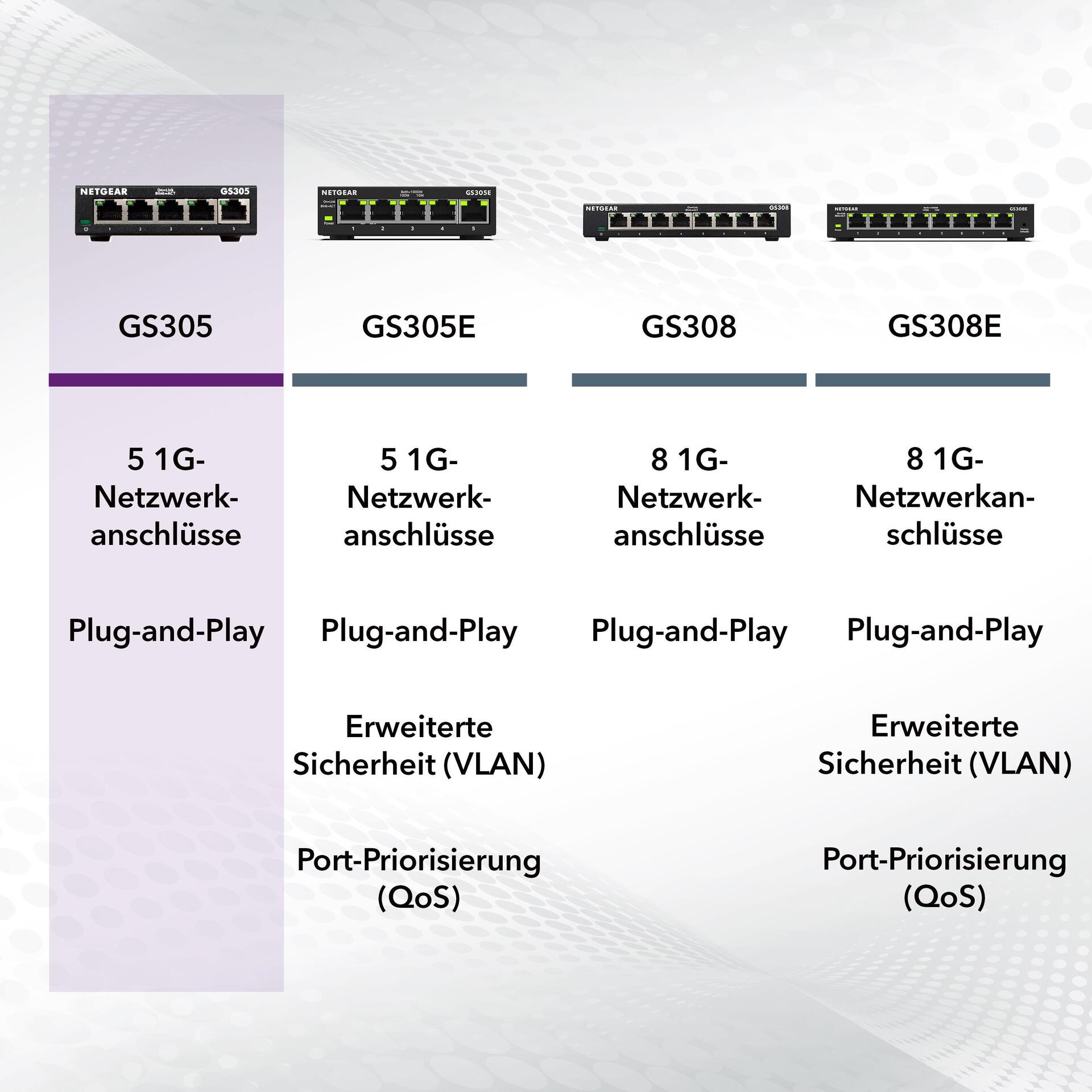 Die NETGEAR SOHO-Ethernet-Unmanaged-Switches ermöglichen benutzerfreundliche und preisgünstige Netzwerkkonnektivität zu Hause und in kleinen Büros. Sie sind einfach zu bedienen und zuverlässig. Mit diesen Plug-and-Play-Switches können Sie Ihre Netzwerkverbindungen auf mehrere Geräte ausweiten. Die Switch-Serie umfasst auch verschiedene Energiespartechnologien, mit denen Sie Strom und Geld sparen können.