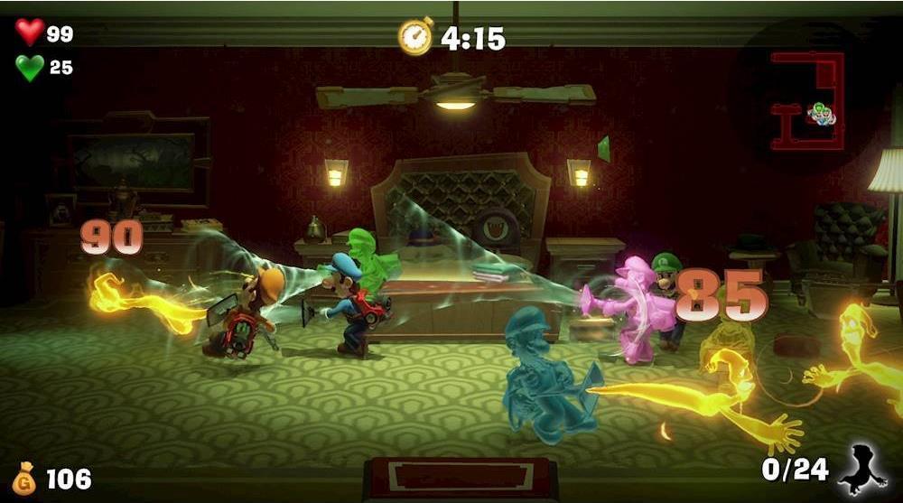 Dabei kann er sich auf den Schreckweg F-LU verlassen. Mit ihm kann er die fiesen Phantome wegpusten, sie zu Boden werfen und sogar seinen glibbrig-grünen Doppelgänger Fluigi beschwören. Fluigi kann Hindernisse überwinden, an denen Luigi allein nicht vorbeikommt. Wechsle zwischen Luigi und Fluigi hin und her, wenn du allein spielst, oder spiele gemeinsam mit einem Freund je einen der beiden Charaktere.