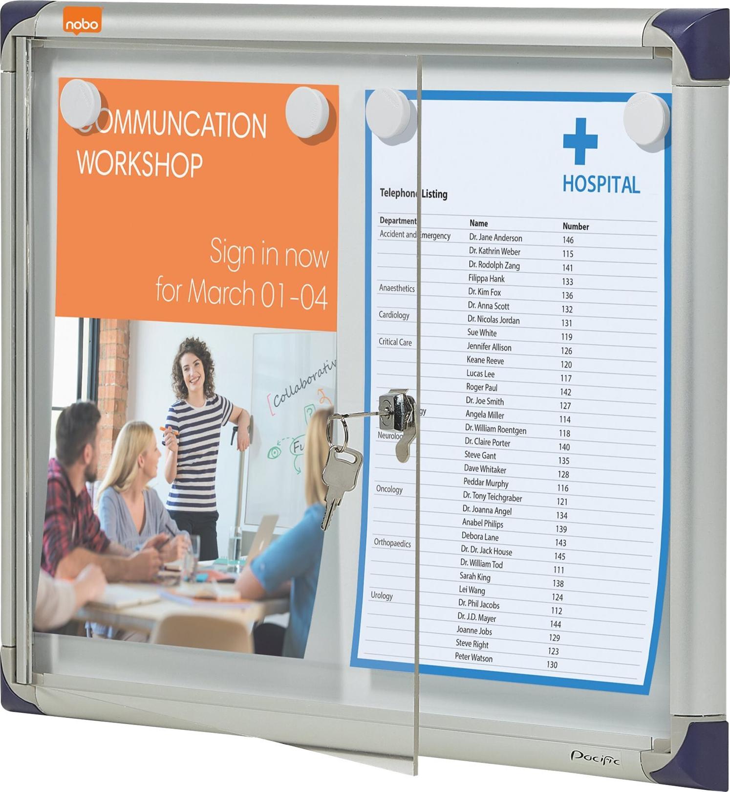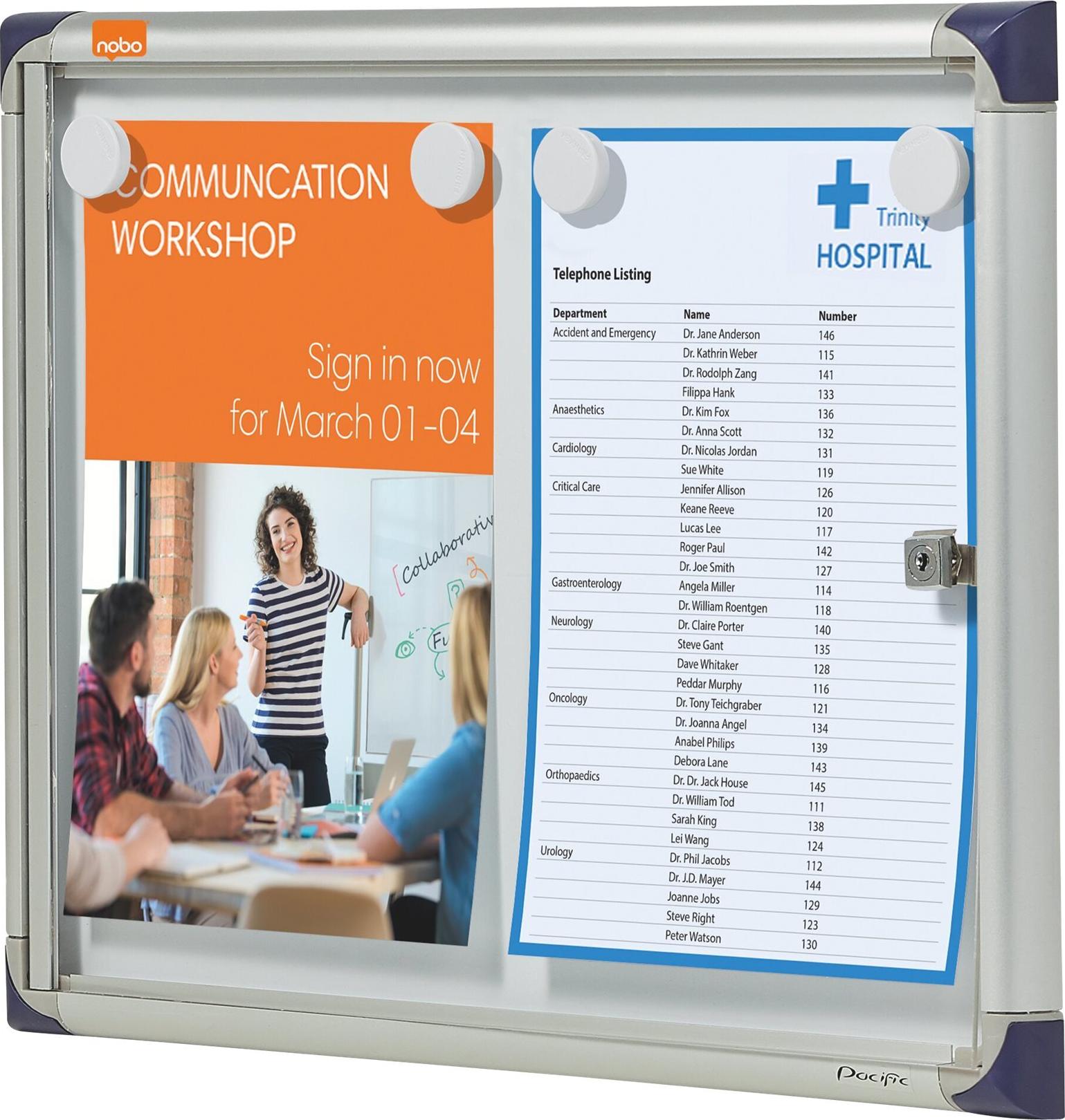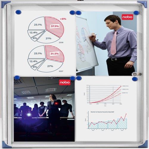 Präsentieren Sie wichtige Informationen einfach und sicher in einem verschließbaren Nobo Schaukasten. Diese extraflachen, praktischen Kästen eignen sich perfekt für vielbenutzte Korridore und Arbeitsplätze. Sie können Aushänge mit Magneten befestigen oder die Weißwandtafel mit Boardmarkern beschriften.