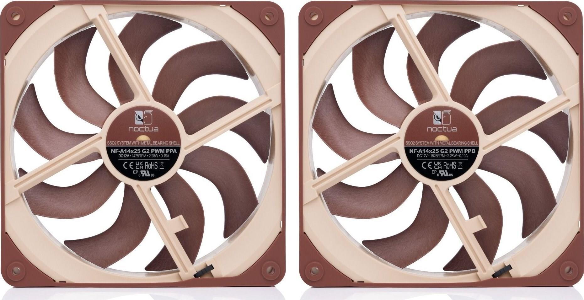 2 NA-RC16 rauscharme Adapter (L.N.A.), NA-YC1 4-poliges PWM Y-Kabel, 2 NA-EC1 Verlängerungskabel (30 cm), 8 NA-AV2 Antivibrationsmontagen, 2 NA-AVG2-LR antivibrationsdichtungen, 8 NA-AVP1-LR Entlastungs-Anti-Vibrationspads, Lüfterschrauben, NF-A14x25 G2 PWM PPA Lüfter, NF-A14x25 G2 PWM PPB-Lüfter |