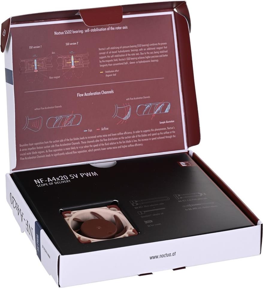 Der NF-A4x20 5V PWM ist eine spezielle, über PWM regelbare 5V-Version von Noctuas hochoptimiertem leisen 40x20mm Premium-Lüfter, der auf das AAO-Rahmensystem und fortschrittliche aerodynamische Konstruktionsmaßnahmen wie Flow Acceleration Channels zurückgreift. Der eigens designte NE-FD3 PWM IC mit integrierter Smooth Commutation Drive Technologie sowie das Referenzklasse-Lager SSO2 garantieren ausgezeichnete Laufruhe und hervorragende Langzeitstabilität.