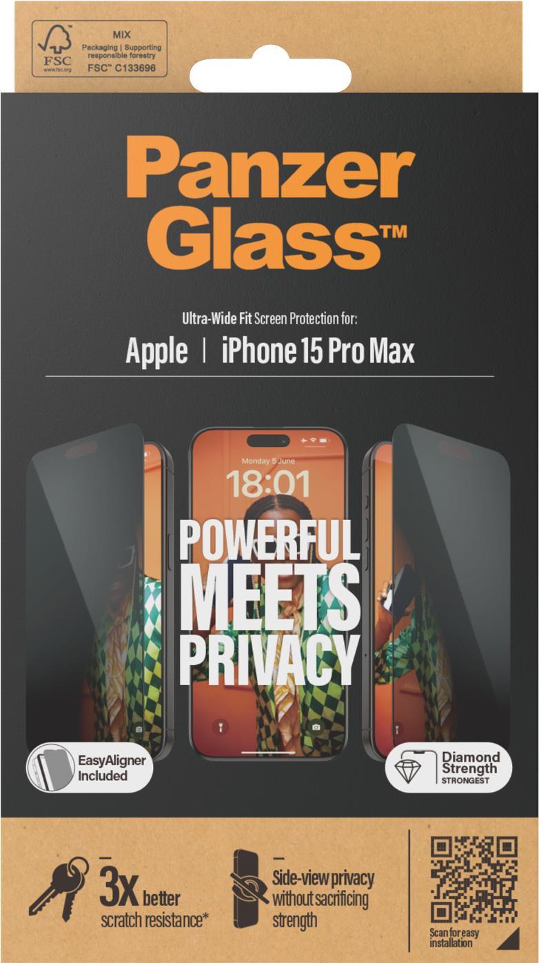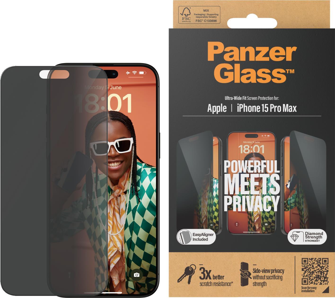 PanzerGlass - Bildschirmschutz für Handy - ultrabreite Passform mit EasyAligner - Glas - mit Sichtschutzfilter - 2-Wege - Rahmenfarbe schwarz - für Apple iPhone 15 Pro Max (P2812)