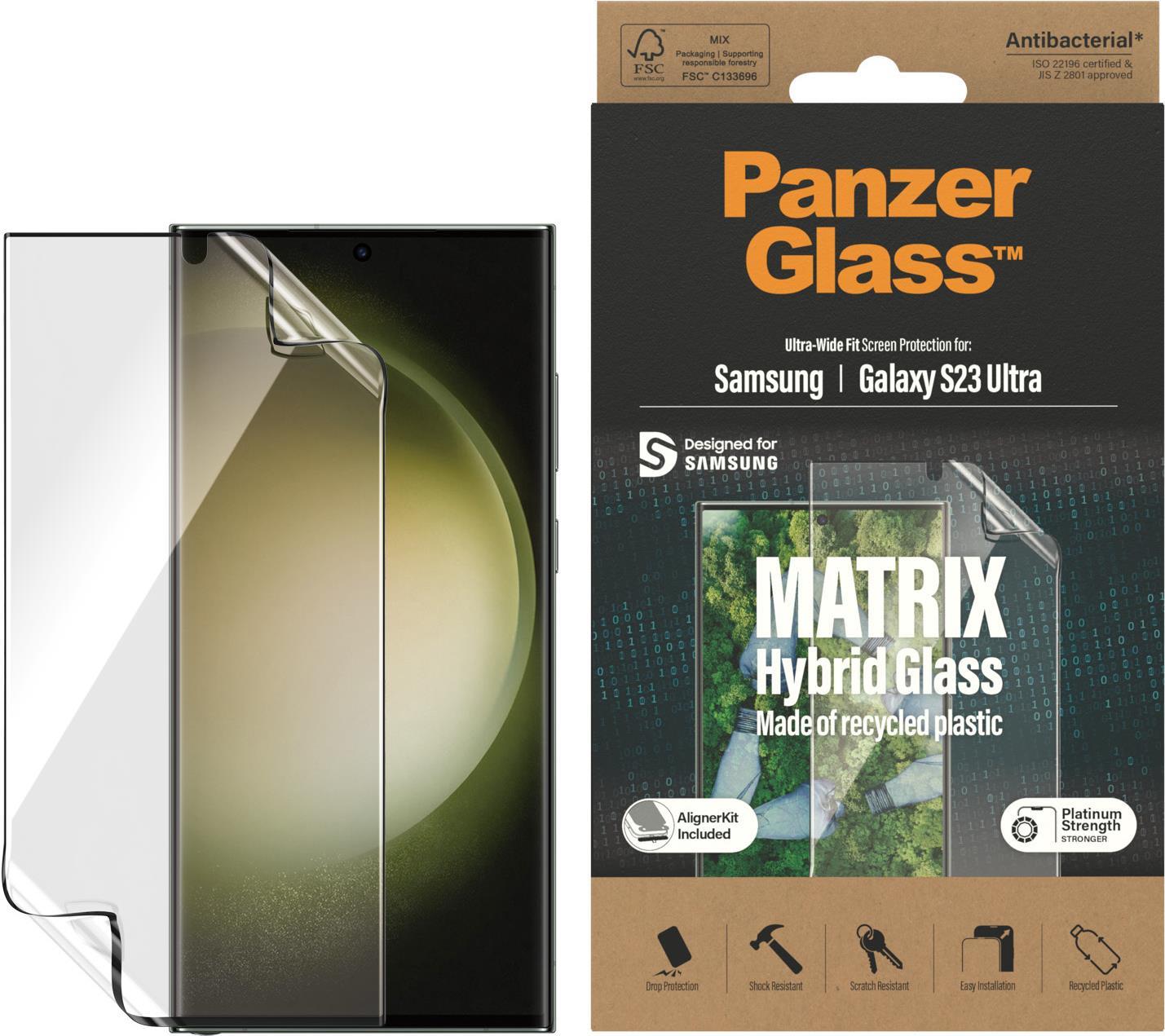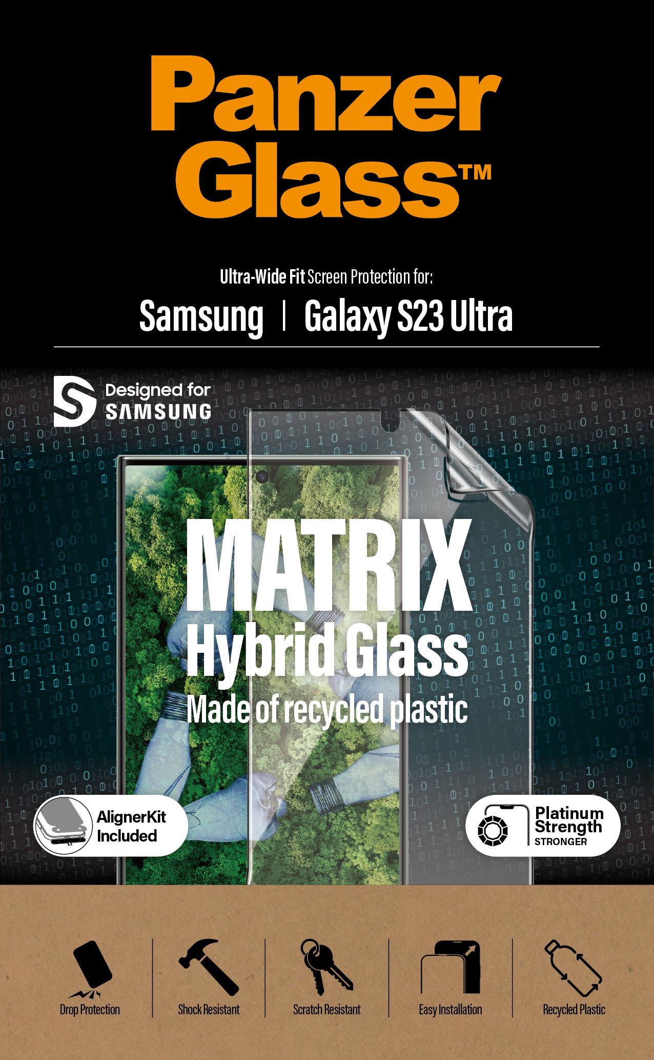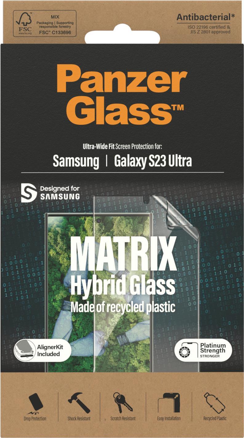 PanzerGlass ist ein moderner, dünner und splitterfester Displayschutz. Bei einem Displayschutz aus Glas sind gerade die Kanten anfällig für Absplittern. Deswegen sind die Kanten abgerundet, um Erschütterungen von Schlägen und Tropfen abzuleiten.Produkttext[/head]Wir wollen einen Wandel - und MATRX bedeutet Wandel. Die revolutionäre Displayschutzfolie besteht zu 100% aus recyceltem Kunststoff und bietet optimalen Schutz, um die Lebensdauer Deines Samsung Galaxy-Smartphones spürbar zu verlängern. Und sie gibt Dir als Komplettlösung ein besseres Benutzererlebnis als je zuvor - von der einfachen Installation bis zum superstarken und vollständigen Schutz, denn MATRIX wurde speziell für die S-Serie von Samsug entwickelt.Mit dem AlignerKit wird die Installation zum Kinderspiel und gelingt im Handumdrehen. MATRIX ist zu 100% mit dem Ultraschall-Fingerabdruckleser von Samsung kompatibel - für ein schnelles und sicheres Entsperren Deines Displays. Und MATRIX ist unzerbrechlich. Klingt fast zu schön, um wahr zu sein? Aber genau so ist es.Du wirst es erleben, wenn Dein Samsung Galaxy gegen scharfe Kanten stößt oder auf harten Boden fällt. Die strapazierfähige Schutzfolie bietet sicheren Schutz vor ärgerlichen Rissen und Kratzern und ist dabei so ultradünn, transparent und federleicht, dass Du sie weder siehst noch spürst. Sobald Du MATRIX installiert hast, kannst Du das entspannte Gefühl genießen, \"zum Warenkorb hinzufügen\" angeklickt zu haben, denn Du weißt, Dein Smartphone ist jetzt sicher geschützt.Du erhältst MARIX als Ultra Wide Fit-Modell, d.h. die Folie deckt das gesamte Display passgenau ab, gewährt Dir einen vollständigen Blick auf alle Inhalte des Displays und lässt dabei genügend Platz für eine passende Schutzhülle. Die Lieferung erfolgt natürlich in einer FSC®-zertifizierten Verpackung.P.S. Dieses Produkt ist von Samsung SMAPP-zertifiziert und garantiert damit die ideale Passform für Dein Samsung Galaxy-Smartphone.[head]Hauptmerkmale