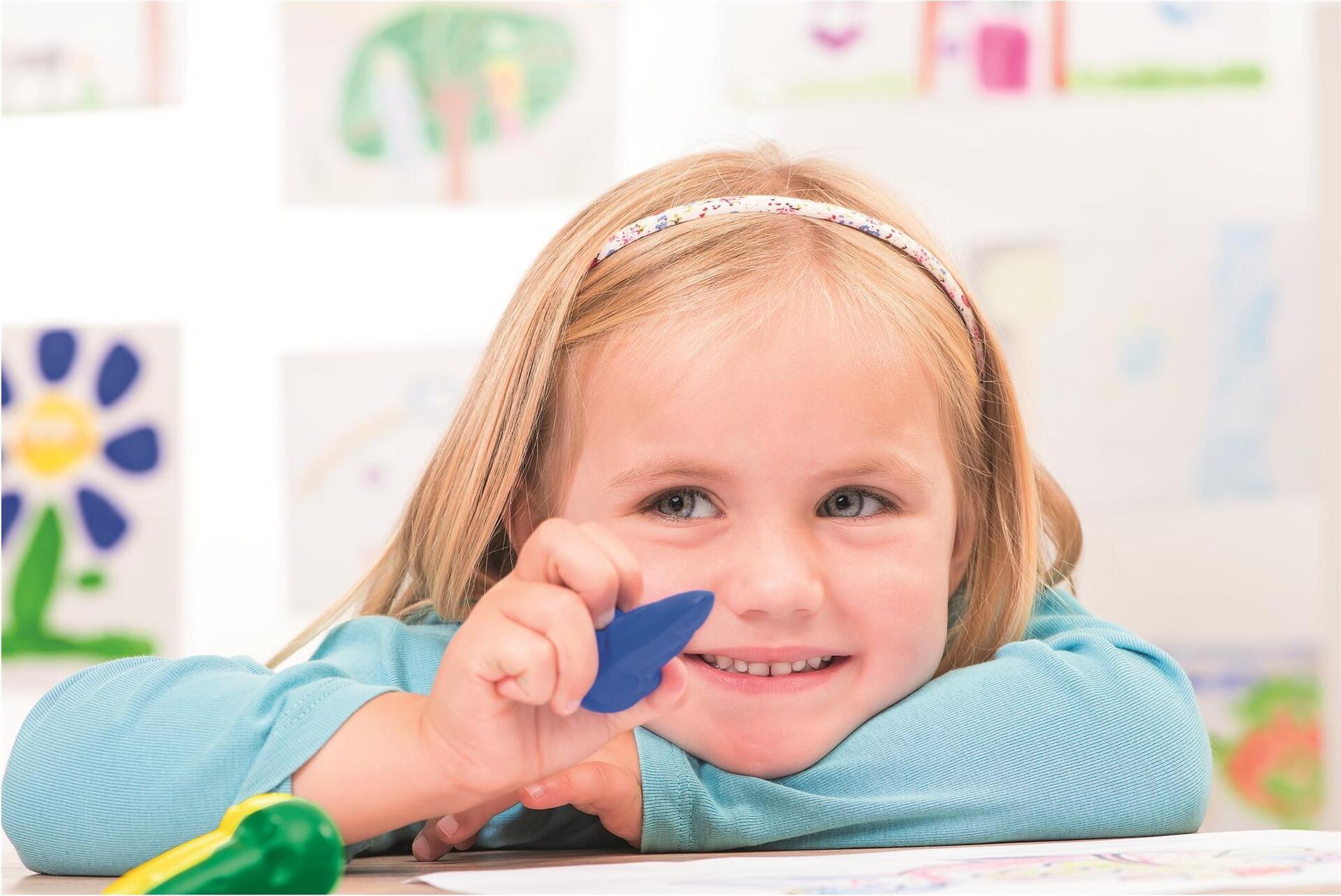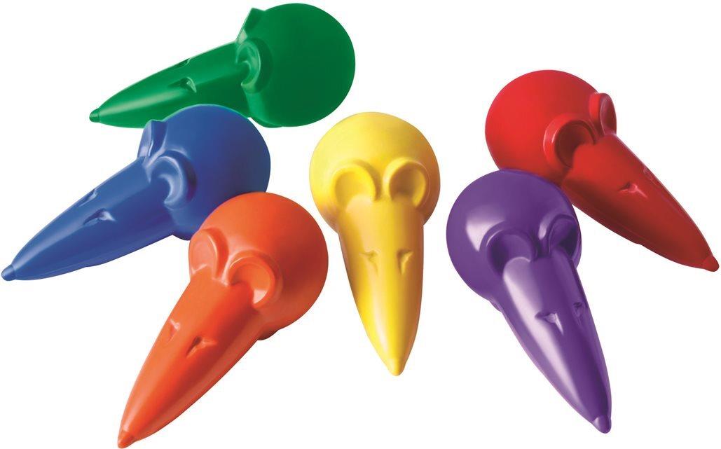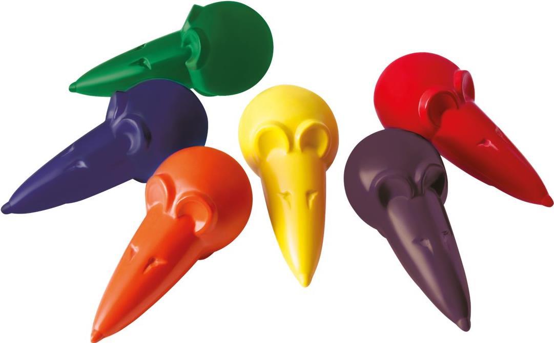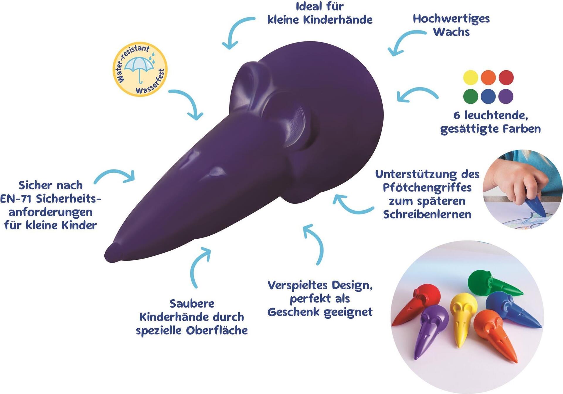 Kindgerechte Wachsmalstifte in Mäuseform in 6 Farben (Blau, Rot, Violett, Grün, Gelb, Orange). Weicher Farbauftrag und kein Abfärben an den Händen. Unterstützt den Pfötchengriffs – wichtig für die Vorbereitung zum Schreiben.