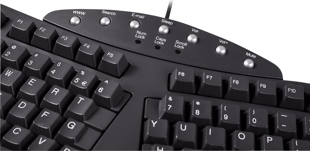 Der Klassiker ist zurück. Die PERIBOARD-512 ist eine ergonomische Tastatur mit geteiltem Tastenfeld. Dank der gewölbten 3-D Form können die Unterarme ganz ohne Anstrengung eine natürliche Haltung einnehmen und die Handballen entspannt auf der Handballenablage aufliegen. Die Tastatur wird vor allem zur Vorbeugung von Tennisarm, Mausarm, RSI-Syndrom sowie bei Sehnenscheidenentzündung empfohlen. Bei bestehenden Beschwerden kann die Tastatur die betroffenen Stellen entlasten. Warum eine ergonomische Tastatur? Dadurch, dass man die Arme nicht künstlich begradigen muss und die Hände in natürlicher Haltung tippen können, wird dem Körper eine unnötige Belastung abgenommen. Eine Fehlhaltung der Hände und Unterarme, die sich bei manch einer Tastatur manifestiert, wird so vermieden. Durch das geteilte Tastenfeld kann man einfach und in natürlicher Haltung tippen, ohne die Hände begradigen zu müssen. Vor allem wird mit dem geteilten Tastenfeld das Schreiben mit dem 10-Finger-System unterstützt. Die PERIBOARD-512 ergonomische Tastatur ist somit ein Bestandteil eines ergonomisch gestalteten Arbeitsplatzes. Die silbernen kleinen Knöpfe an der Tastatur sind Multimedia Tasten. Sie sind praktische Helfer bei Video und Audio sowie bei Internet Funktionen.