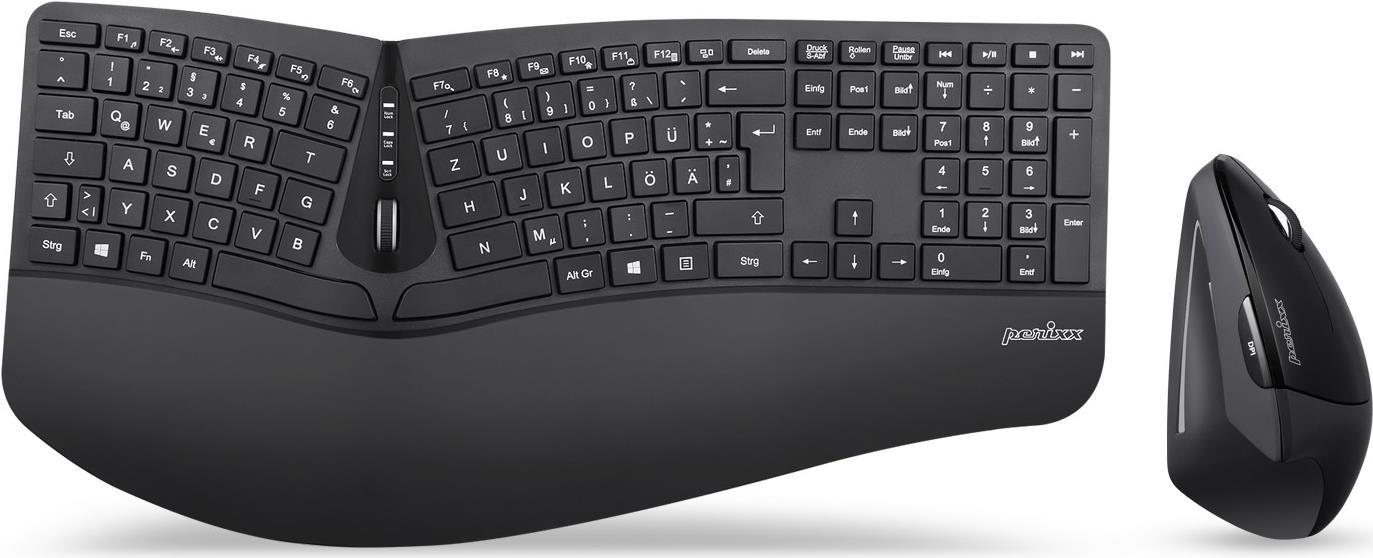 Perixx PERIDUO-605BDE Funk Tastatur, Maus-Set Deutsch, QWERTZ, Windows® Schwarz Ergonomisch, Multimediatasten, Handballenauflage (11612)