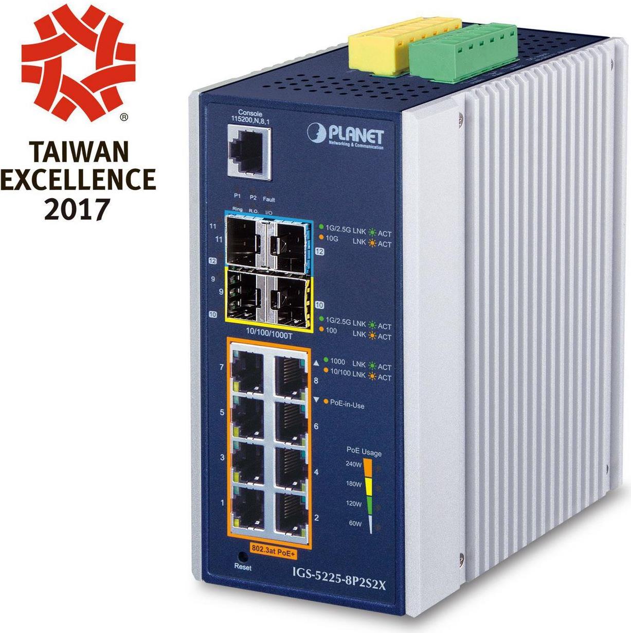 PLANET IGS-5225-8P2S2X ist ein unglaublich kleiner 10G Uplink Layer 3 Managed PoE Switch, der vorzugsweise für industrielle Netzwerke entwickelt wurde. Der IGS-5225-8P2S2X ist mit 8 Gigabit-Ports mit 36 Watt 802.3at PoE+ und zwei 10Gbps SFP+ Uplink-Steckplätzen ausgestattet und erfüllt die Anforderungen an einen hohen Stromverbrauch und eine hohe Bandbreite für 11ac Gigabit Wi-Fi APs und andere PoE-Anwendungen, die eine hohe Verkehrsbelastung erfordern.