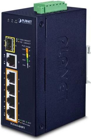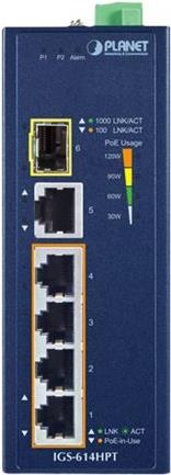 Planet IGS-614HPT. Basic Switching RJ-45 Ethernet Ports-Typ: Gigabit Ethernet (10/100/1000), Anzahl der basisschaltenden RJ-45 Ethernet Ports: 5. Routing-/Switching-Kapazität: 12 Gbit/s. Netzstandard: IEEE 802.1p,IEEE 802.3,IEEE 802.3ab,IEEE 802.3af,IEEE 802.3at,IEEE 802.3az,IEEE 802.3u,IEEE 802.3x. Power over Ethernet (PoE). Wandmontage (IGS-614HPT)