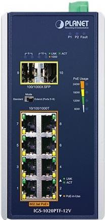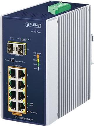 Der PLANET IGS-1020PTF-12V ist ein industrietauglicher Unmanaged Gigabit Ethernet PoE+ Switch auf DIN-Schiene mit acht 10/100/1000BASE-T Ports mit IEEE 802.3at PoE+ und zwei 100/1000BASE-X Glasfaserschnittstellen für Uplink-Verbindungen.