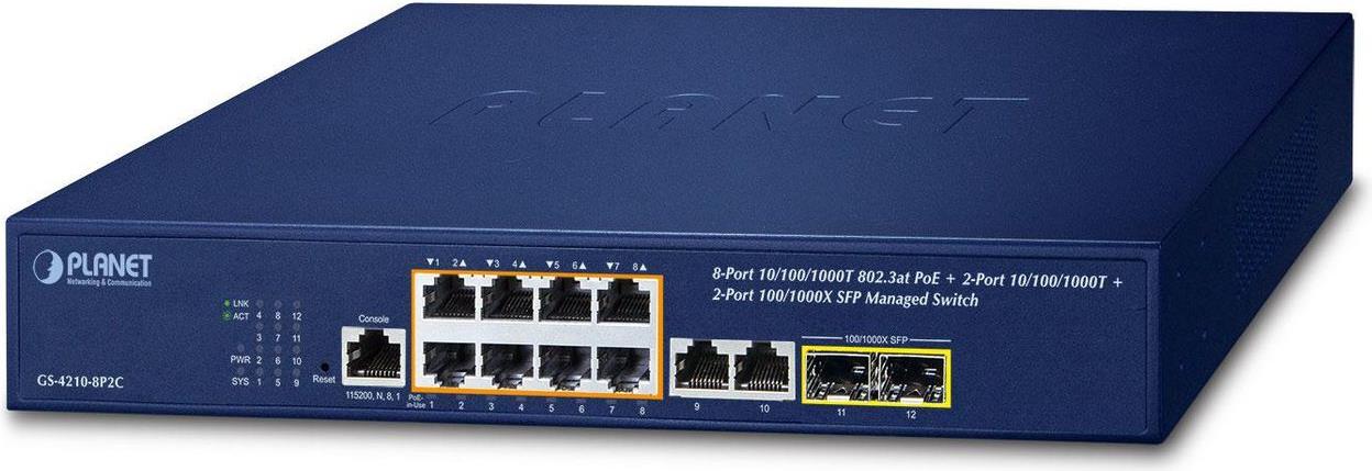 PLANET IPv4/IPv6 - 8-Port Managed L2/L4 Gigabit Ethernet (10/100/1000) Power over Ethernet (PoE) 1U Blau (GS-4210-8P2C)