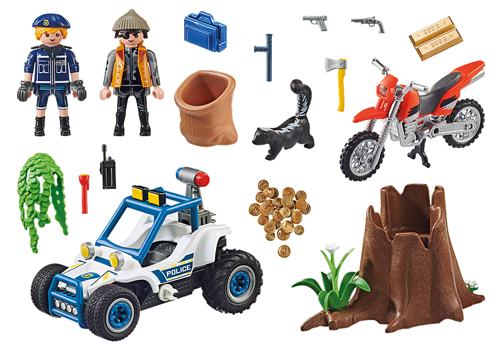 1 Polizist, 1 Ganove Zubehör: 1 Polizei-Geländewagen, 1 Motocross-Bike, 1 Baumstumpf mit Blumen und hängender Flechte, 1 Sack, 1 Axt, Goldmünzen, 1 Koffer, 1 Taschenlampe, 1 Funkgerät, 1 Paar Handschellen, 1 Polizeimütze, 1 Ganoven-Mütze, 1 Paar Handschuhe |