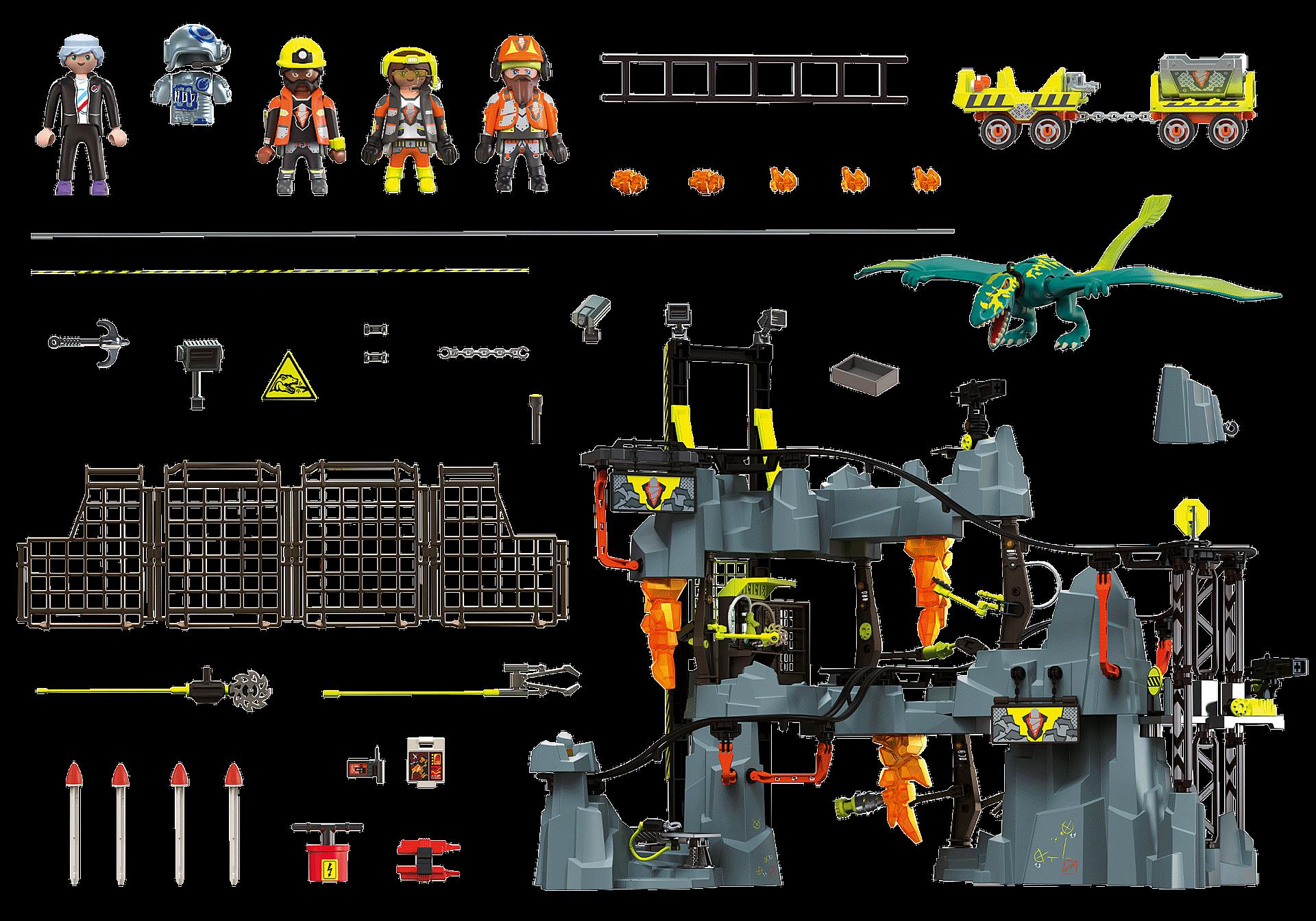 Figuren: Kaidan, Minenchef, Minenarbeiterin, Minenarbeiter Tiere: 1 Dimorphodon Zubehör: komplette Rüstung für Kaidan, komplette Mine, Gleisanlage wie eine kleine Achterbahn, Weichen zum Verstellen, Minecruiser, Minecruiser Anhänger inkl. Lore, Aufzug, Zäune, 2 Raketen, 4 Geschosse, Widerhaken mit Griff und Schnur, Labor, verschiedene Werkzeuge, bewegliche Bohr- und Greifarme, 2 Kameras, 3 Scheinwerfer, 3 Stalktiten, 2 Stangen Dynamit mit Zündschnur und Auslösekiste, 2 Hängeschilder, Ausbruchfels, Kette des Dinos, 1 Bauhelm, 1 Bauhelm mit Gehörschutz, 2 Handschuhe, 2 Stirnbänder mit Display und Visier, 1 Karte, 1 Schneidepult für Energiesteine, Greifer für Energiesteine, Handsäge mit großem Sägeblatt 1 Armbanduhr, 1 GPS, 3 Energiesteine, 3 Gesteinsproben, 1 Aufbewahrungsbox, 4 Schilder, 1 Strahlrohr |