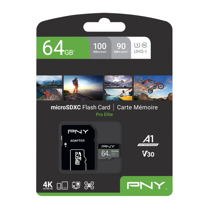 PNY PRO Elite microSD-Karten bieten Spitzenleistungen für Smartphones, Tablets, Action-Kameras, Drohnen, DSLRs, Videokameras und andere Geräte.